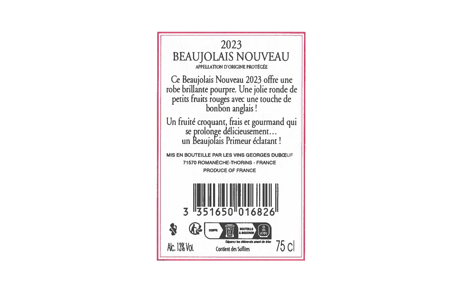 | Libellé | Georges Duboeuf, 2023 - Beaujolais Nouveau AOP - Rouge - 75 cl |