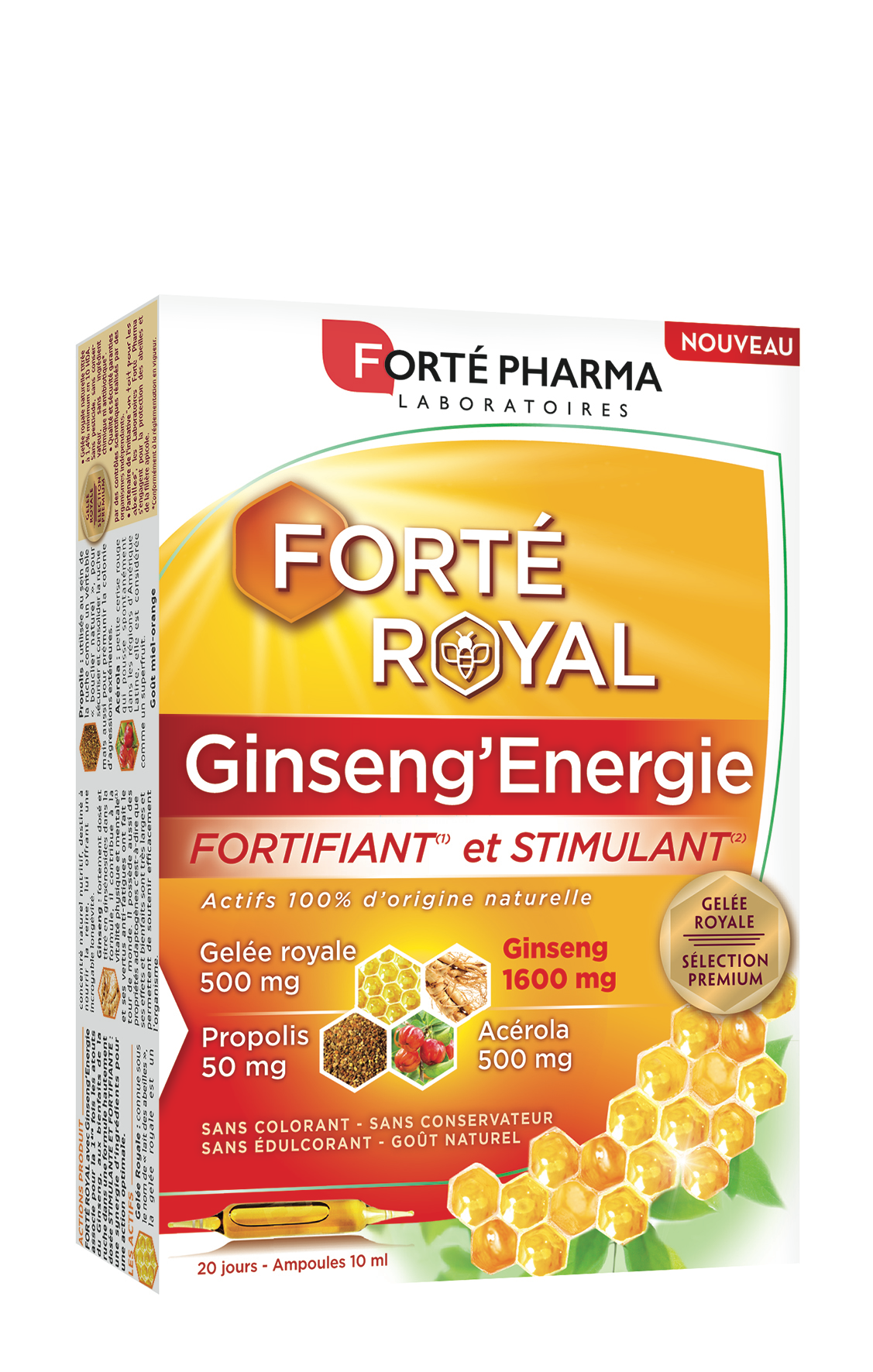 Ingrédients : Eau purifiée, jus concentré d’orange, gelée royale (500 mg), jus concentré de baie d’acérola (malpighia glabra l.) (500 mg), extraits de ginseng (panax ginseng ca meyer) (483,5 mg équivalent à 1600 mg de ginseng dont 15,5 mg ginsénosides), miel (450 mg), extrait hydroglycériné de propolis (333 mg équivalent à 50 mg de propolis).