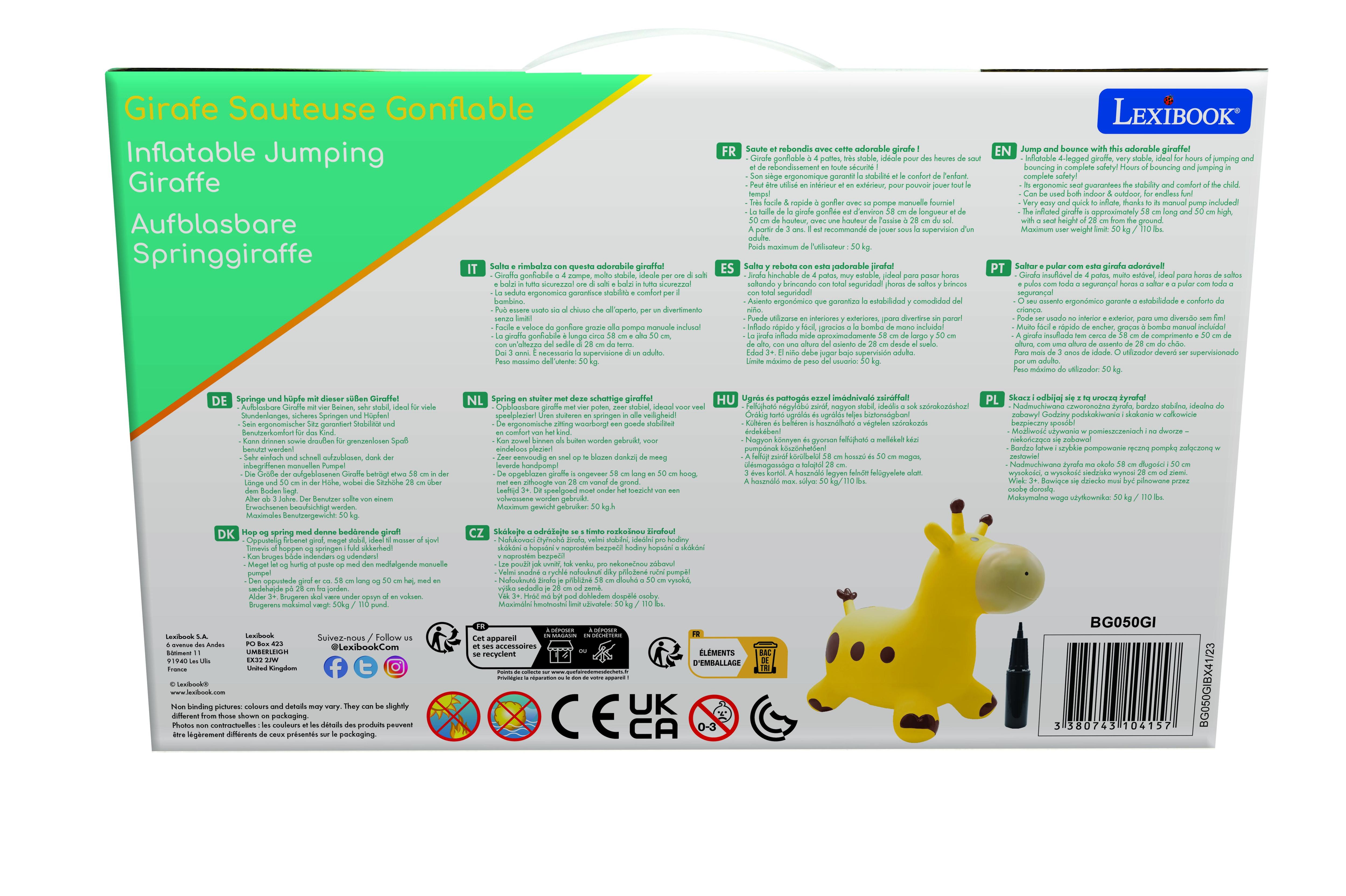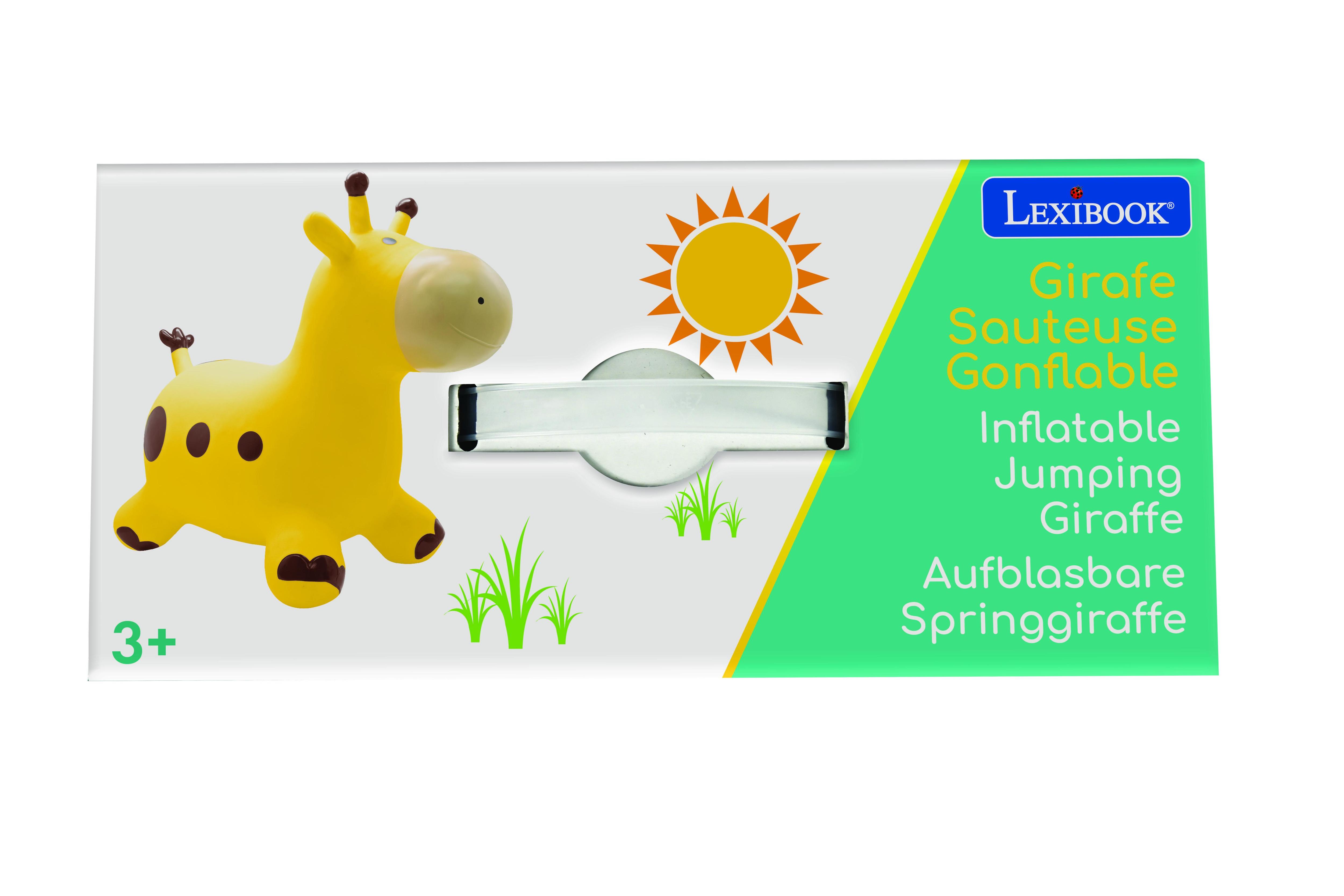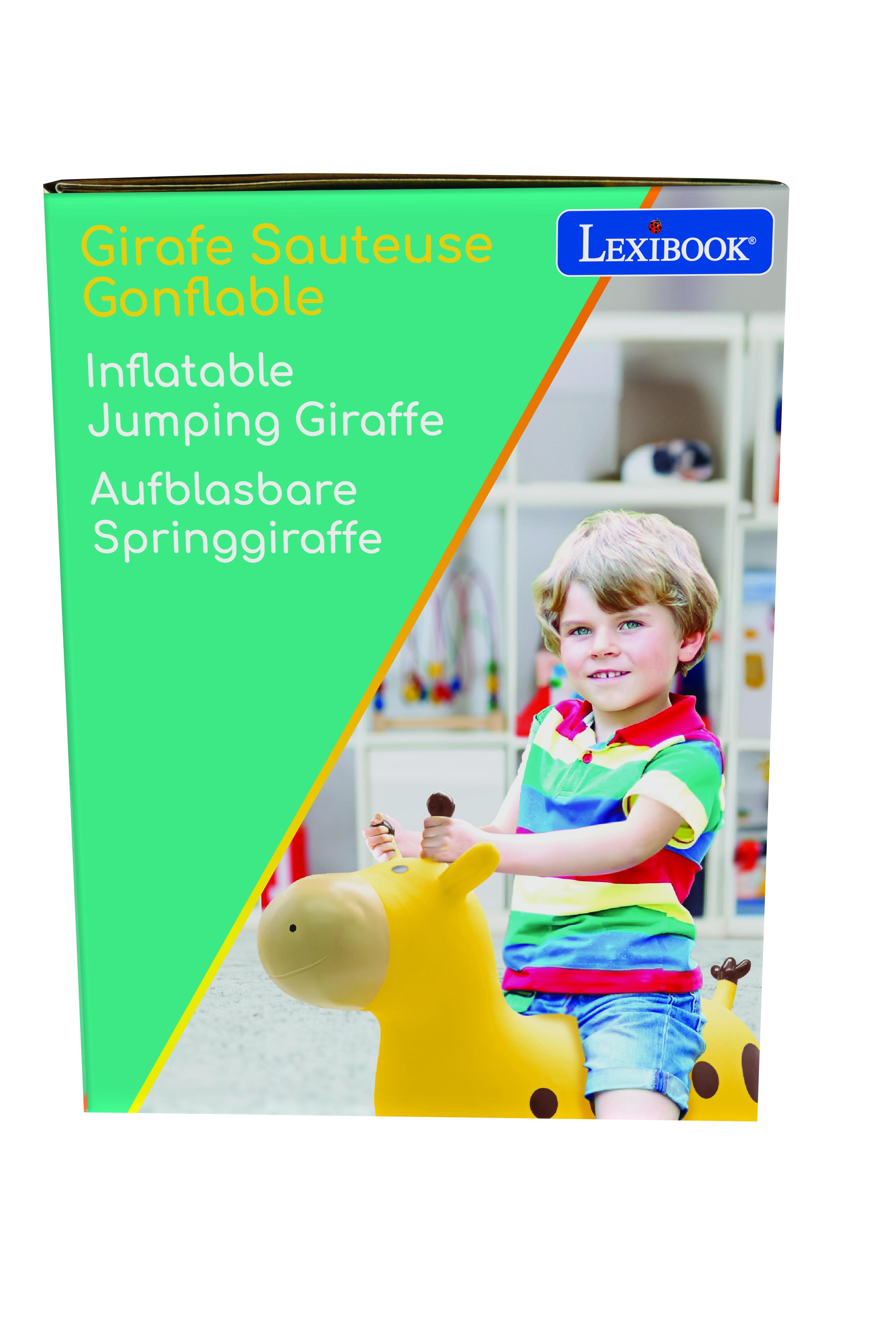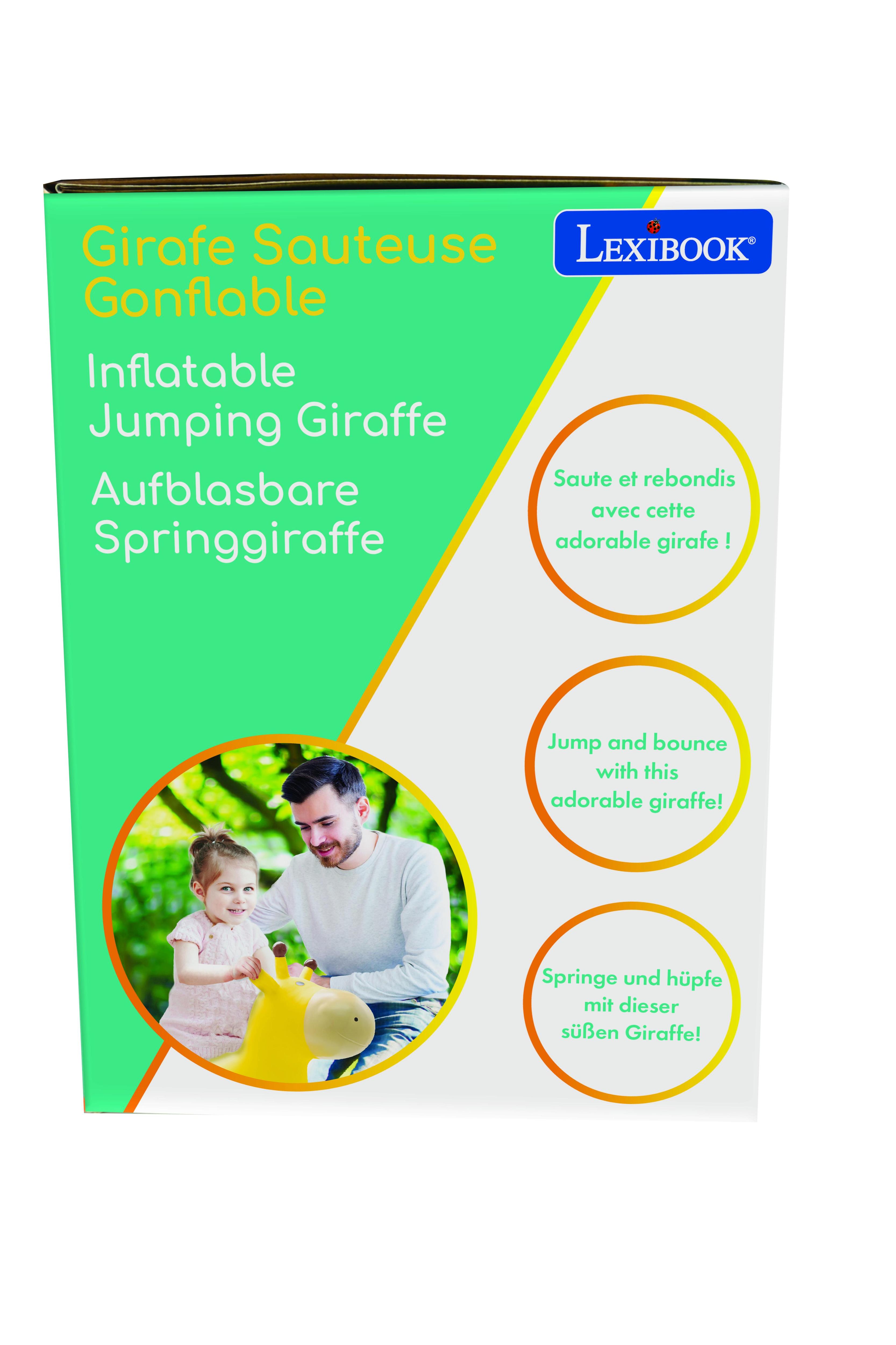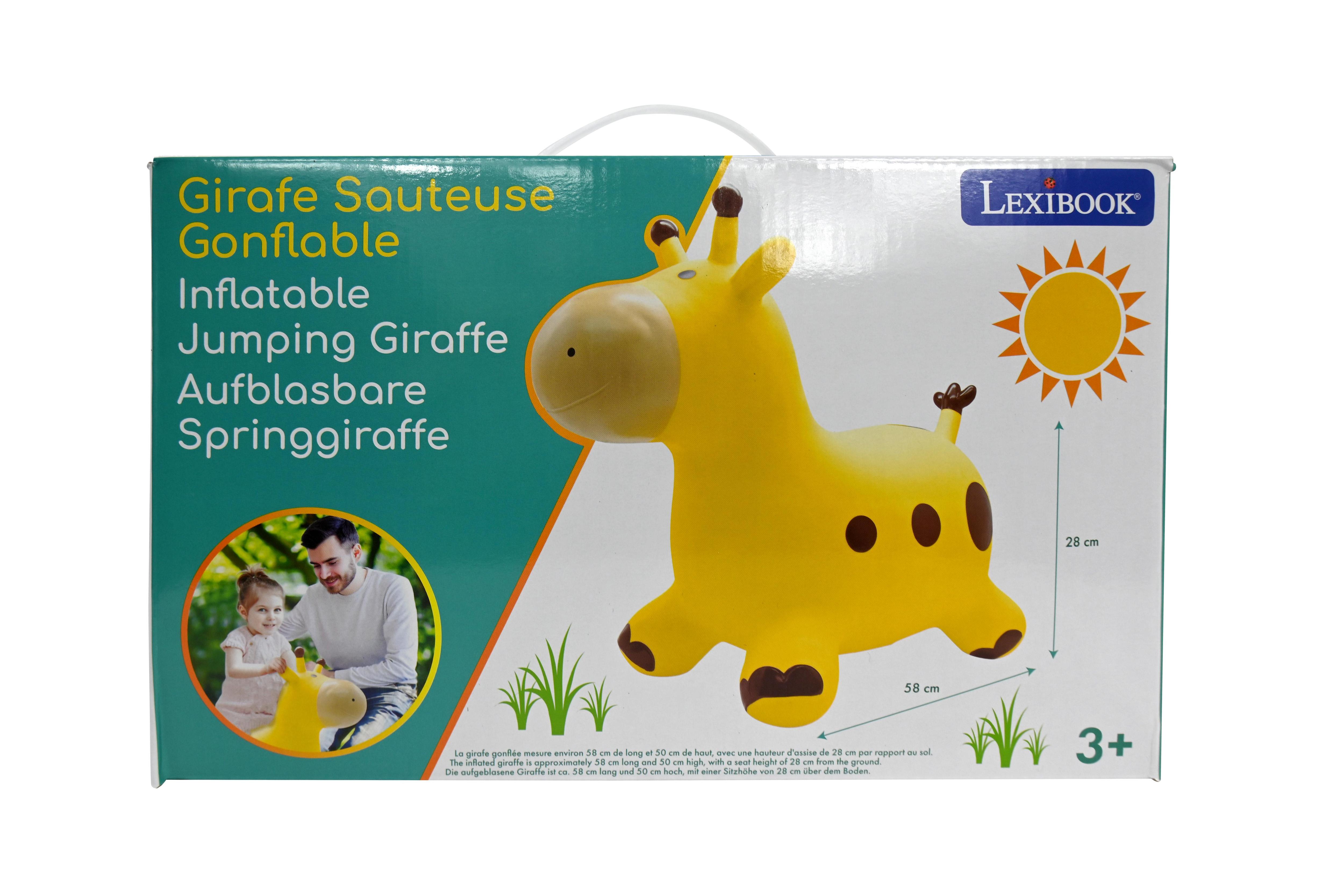 * Saute et rebondis partout avec cette adorable girafe ! * Girafe gonflable à 4 pattes, très stable, idéal pour des heures de saut et de rebondissement en toute sécurité ! * Son siège ergonomique garantit la stabilité et le confort de l'enfant. * Peut être utilisé en intérieur et en extérieur, pour pouvoir jouer tout le temps ! * Très facile & rapide à gonfler avec sa pompe manuelle fournie ! * La taille de la girafe gonflée est d’environ 50 cm de longueur et de 45 cm de hauteur, avec une hauteur de l'assise à 28 cm du sol. * A partir de 3 ans. Il est recommandé de jouer sous la supervision d'un adulte. * Poids maximum de l'utilisateur : 50 kg.