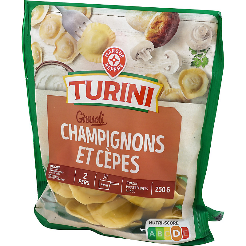 Pâtes fraîches à la farine de blé tendre et à la semoule de blé dur aux œufs, farcies d'une préparation (52%) aux champignons, au mascarpone et aux cèpes TURINI