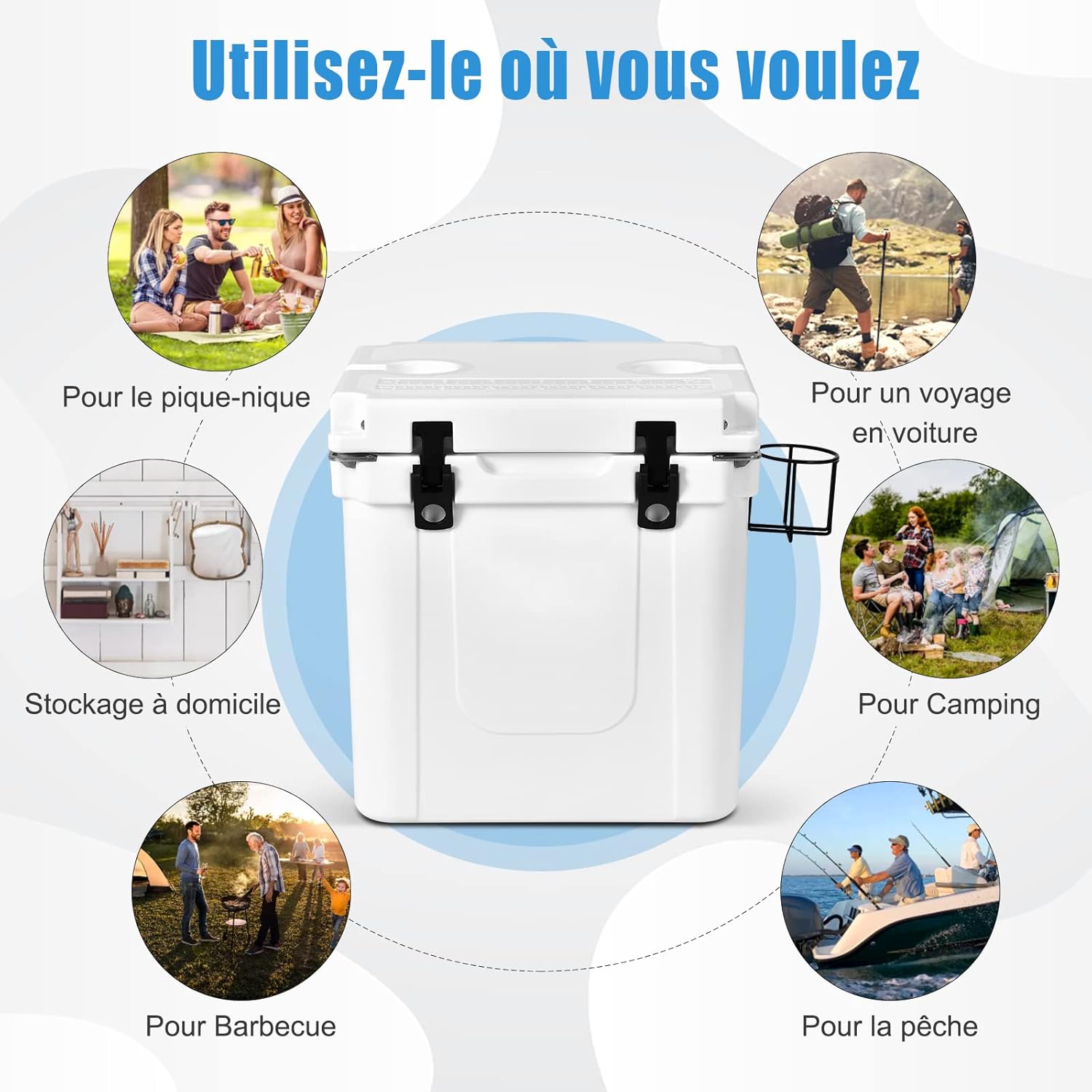 Notre glacière de camping est fabriquée en PE qui est bien robuste et non toxique. L’isolation thermique a un excellent effet grâce à l’incrustée d’un joint en silicone. Cette glacière adopte la conception sans électricité, qui réflète le concept écologique. Et les détails bien intimes tels que trou de drainage, 4 pieds antidérapants, 2 porte-gobelets encastrés sur le couvercle, forme d’un ouvre-bouteille sur les 2 coins, facilitent votre utilisation. De plus, les accessoires équipées comme la corbeille de fruits et le porte-gobelet rendent votre camping plus confortable. N’hésitez plus !