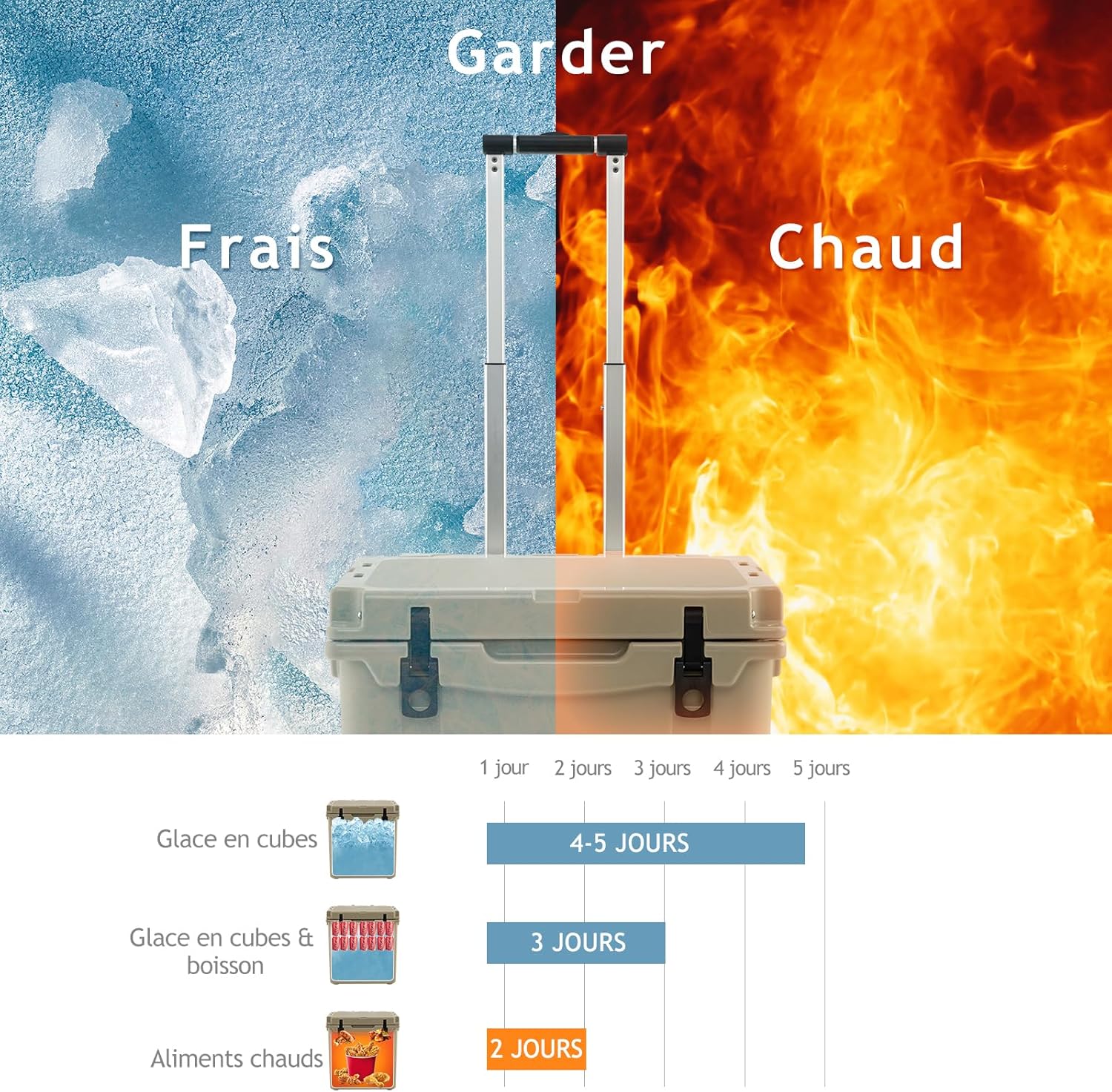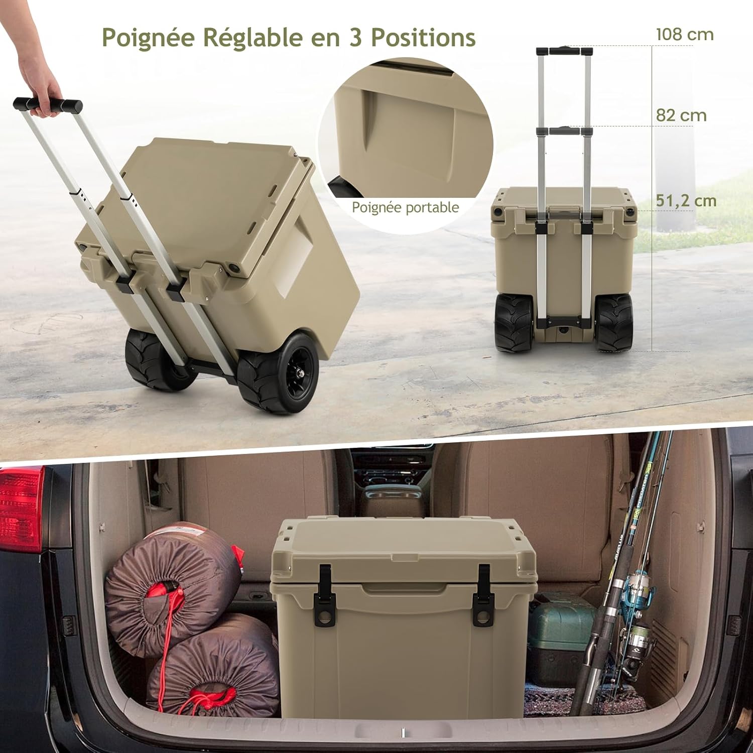 - # Poignée réglable et roues tout-terrain # La glacière de camping est équipée d'une poignée réglable en 3 positions (108 cm, 82 cm et 51,5 cm au-dessus du sol ) . Les roues tout-terrain conviennent à toutes les surfaces extérieures, ce qui signifie que vous pouvez facilement la déplacer n'importe où.