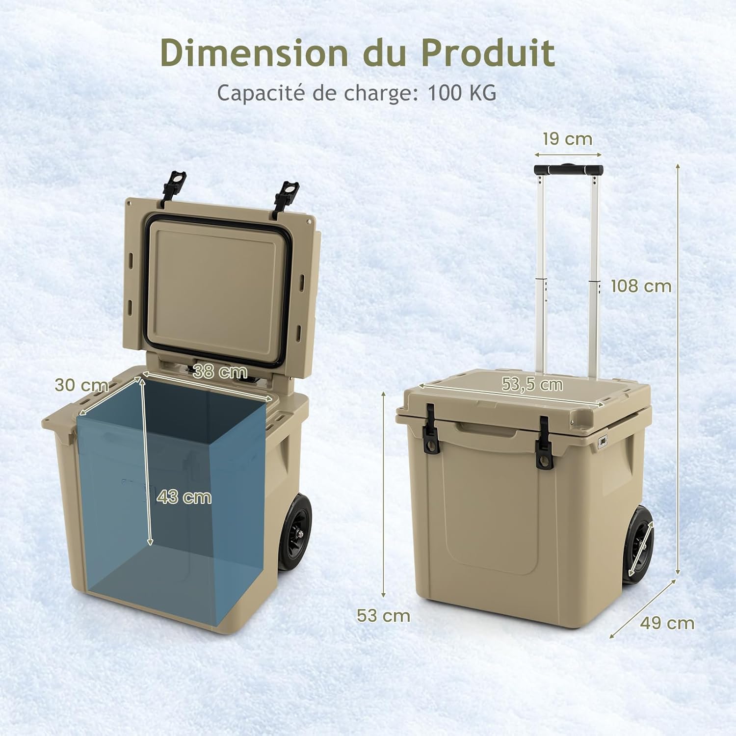 Glacière portable à roulettes 43 l, boîte isotherme avec roues & poignée réglable en 3 positions