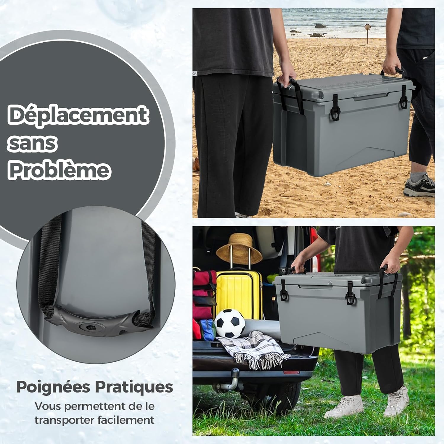 - # Transport et Nettoyage Faciles # Equipée de poignées pratiques, vous pouvez transporter sans effort cette glacière portable isolée n'importe où. De plus, le système de drainage rapide avec bouchon simplifie le nettoyage sans avoir à retourner la glacière.
