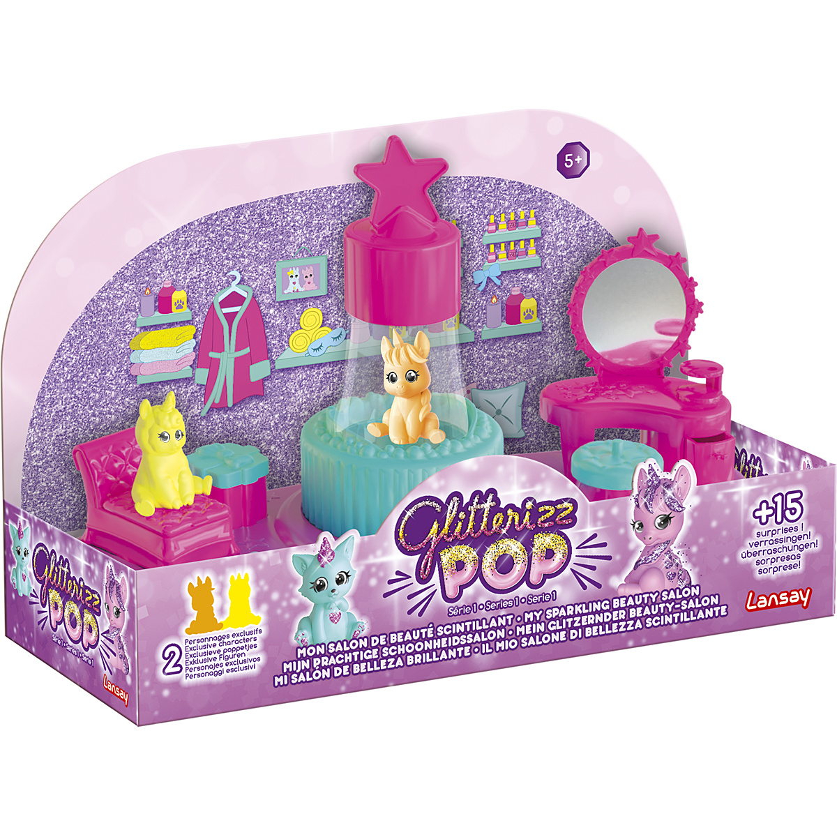 Offre un soin à tes Glitterizz Pop dans ce superbe Salon de Beauté Scintillant et fais briller tes 2 personnages exclusifs grâce au jacuzzi et à la douche de paillettes !
