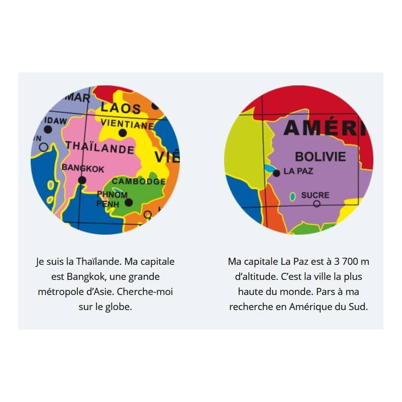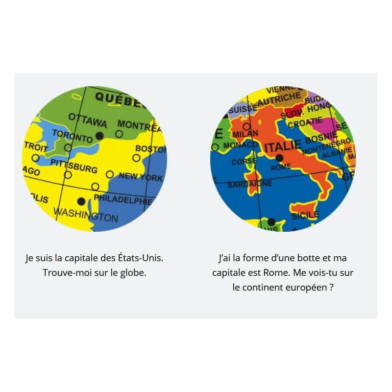 Ce globe gonflable de 30cm permet de jouer avec le monde afin d'apprendre les pays et leurs frontières, les capitales, les grandes villes du monde et les îles principales.