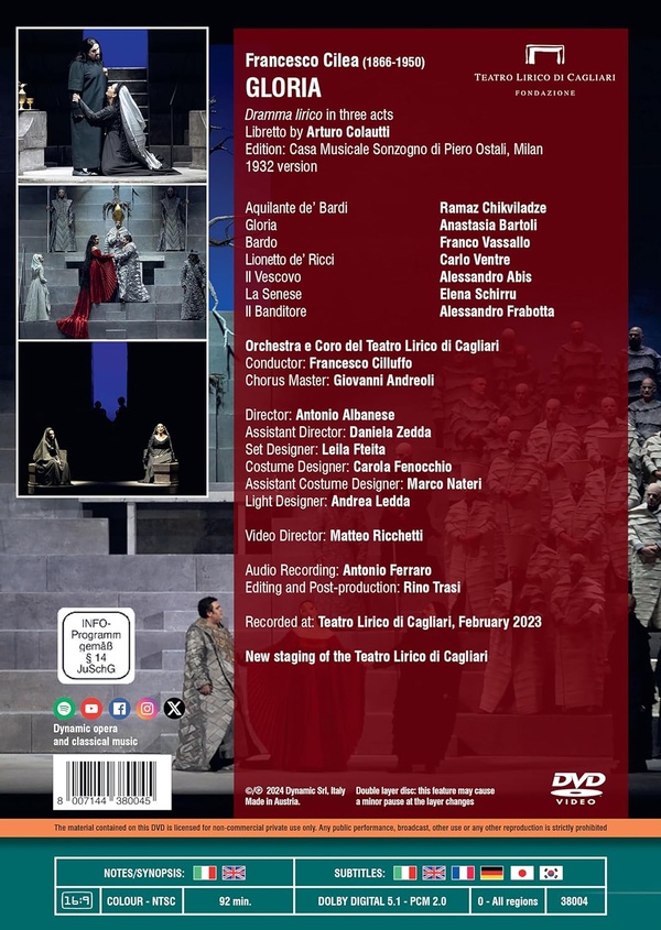 Gloria de Francesco Cilea, ici dans la version révisée de 1932, traite de l'histoire finalement tragique de deux amants impliqués dans un conflit à Sienne au 14ème siècle. Le livret est basé sur la pièce La Haine de Victorien Sardou (La Haine) et l'opéra présente la composition orchestrale sophistiquée de Cilea inspirée des écoles russe et française avec des lignes vocales variées et enrichissantes. Opera Today a qualifié cette production de « musicalement magique », tandis qu'Operawire.com a loué la mise en scène imaginative et convaincante ainsi que la direction musicale convaincante de Francesco Cilluffo.