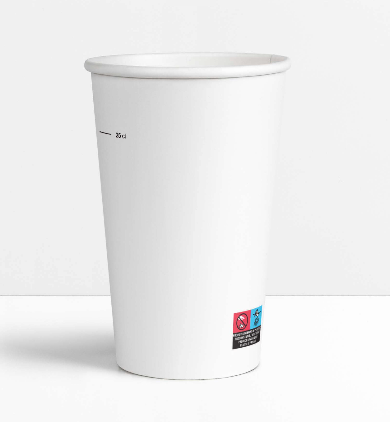 Description Gobelet carton blanc 35 cl avec graduation 25 cl et marquage UE Code Produit Colis reconstitué petite série (1 ramette de 80) : 221280GOB Code produit Colis 2000 : 22128025GOB Laminé couche PE et recyclable Le gobelet en carton cl : idéal pour la vente à emporter de boissons froides ou chaudes ! Ces gobelets en carton blanc ont une contenance de 35 cl. Ils sont idéaux pour tout type de boissons froides ou chaudes. Adaptés aux boissons chaudes (café, thé, chocolat chaud...) grâce à leur grammage de 235gsm/m2 ou froides (eau, soda, jus de fruits...), nos gobelets carton supportent des liquides allant jusqu'à +120°C et peuvent même passer au micro-ondes (passage rapide). Ils sont résistants et totalement étanches. Nos gobelets en carton seront parfaits pour la vente à emporter de boissons. Grâce à leur capacité moyenne de 8 oz, ils pourront même être utilisés comme pot pour condiments (plateau-repas traiteur, fast-food...). De couleur blanche, ils s'adapteront parfaitement à toutes vos ambiances. Les gobelets en carton vendus sur la marketplace Covr sont recyclables après utilisation et certifiés aptes au contact alimentaire. Nos gobelets en carton à usage unique sont conditionnés par lots de 25 ramettes de 80 gobelets soit 2000 gobelets par carton. Ils bénéficient d'un rapport qualité/prix imbattables : vous payez votre gobelet seulement 0,0549€HT l'unité ! Et à ce prix, la livraison est incluse ! Nous livrons partout en France en 48/72h. Ils seront parfaits pour les professionnels à la recherche d'un produit pratique et économique. C'est une bonne alternative pour remplacer les gobelets en plastique. Caractéristiques Epaisseur carton : 235 gsm/m2 - 15 PE Contenance : 12 oz / 350 ml Diamètre haut (mm) : 80 Hauteur (mm) : 117 Diamètre bas (mm) : 51 Poids (gr) : 7,5 Ramettes : 80 Ramettes par carton : 25 Gobelets par carton: Total: 2000 Dimensions carton WxDxH (cm) : 40x40x63,5 Poids carton (kg) : 16 Volume carton (m3) : 0.106 Palletisation (GKN/Euro) : 80x120 cm Hauteur palette (m) : 2.15 Cartons par niveau : 6 Cartons par palette : 18 Poids palette (kg): 303 kg