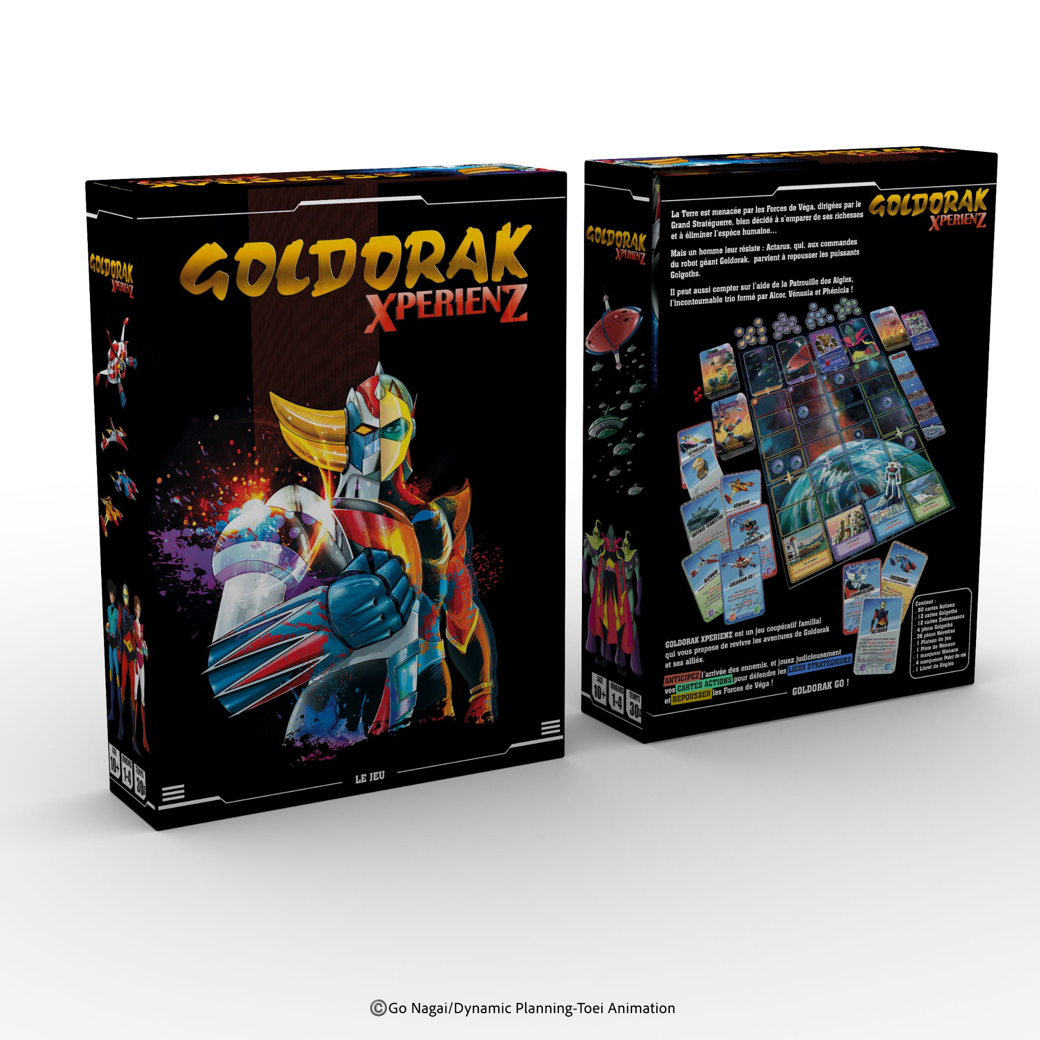 | Plus produit | Jeu coopératif familial (1-4 joueurs) inspiré de l'univers Goldorak, mécanique de programmation, cartes et tower defense, parties d'environ 30 minutes, contient plateau, piste de menace, marqueurs et livret de règles. |
