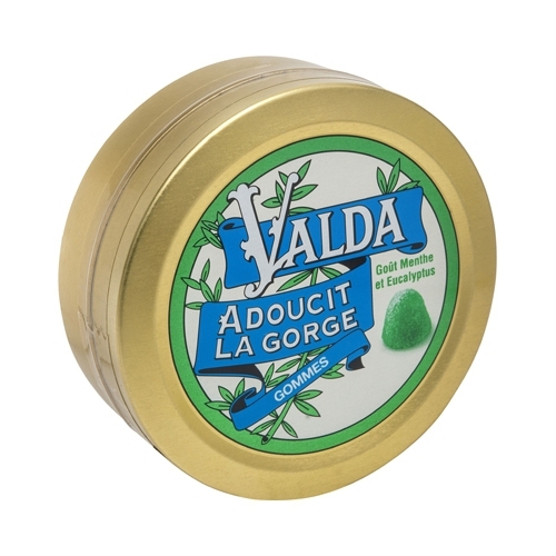VALDA Gommes Avec Sucres Goût Menthe eucalyptus - 50 g. Depuis plus de 120 ans, les gommes Valda vous accompagnent pour adourcir votre gorge au quotidien. Savourez les dans leur version goût menthe eucalyptus avec sucres, pour encore plus de plaisir! Grâce à leur format de poche 50g, emportez vos gommes Valda partout avec vous.