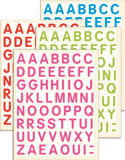Ces 960 gommettes, représentant des lettres majuscules, sont réparties sur 16 planches et dans 4 couleurs assorties : rouge, vert, rose et bleu.