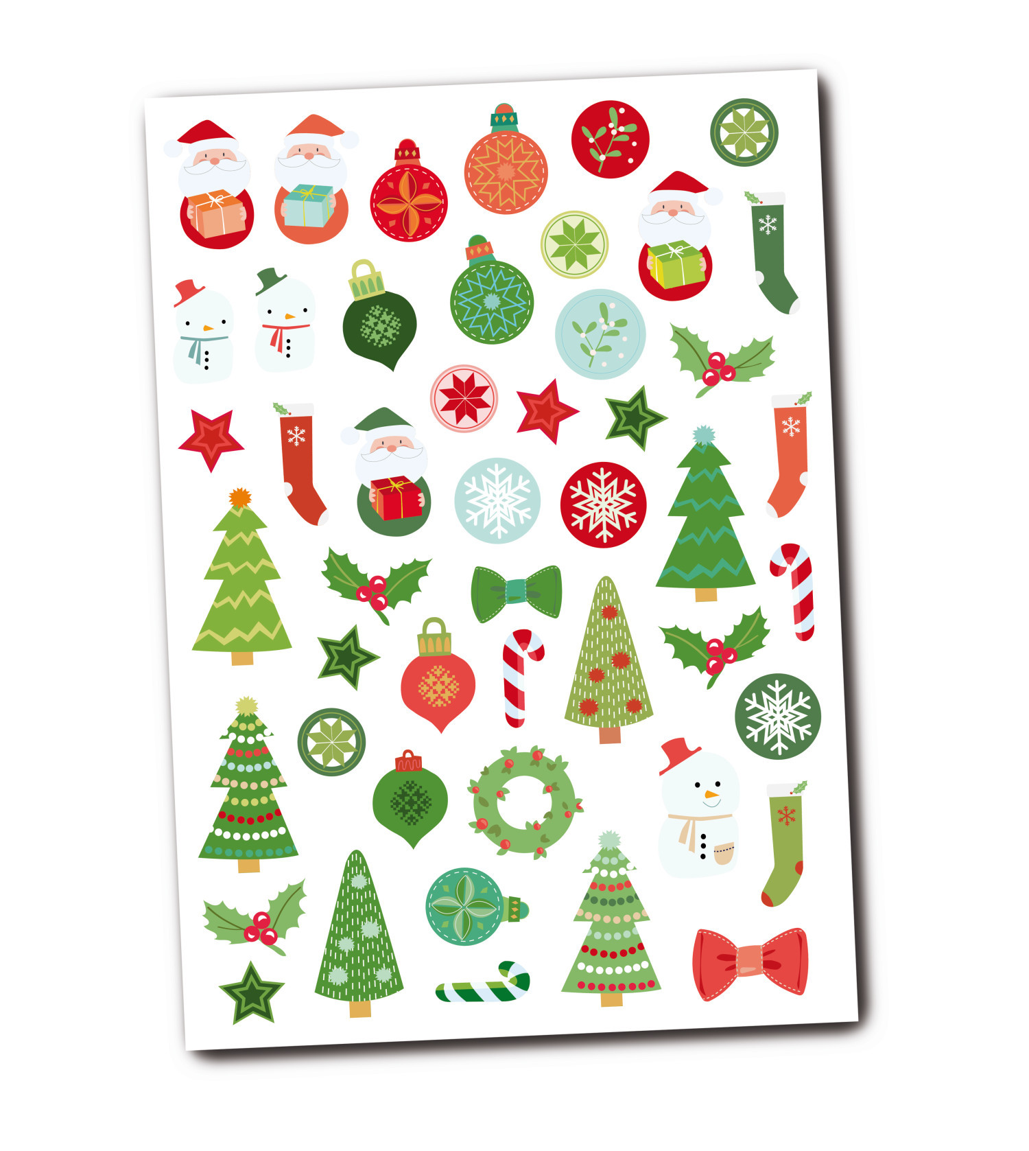 96 gommettes couleurs et tailles assorties Dimensions : de 1,5 à 4,2cm 2 planches de gommettes Motifs : Sapin - noeud - boules de noël - Père Noël - canne à sucre - bonhomme de neige - Houx - Etoiles - Chaussettes de noël
