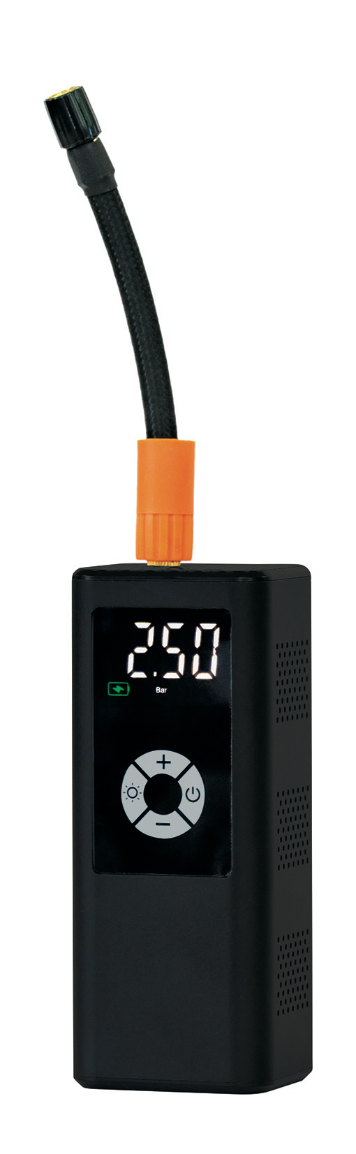 Gonfleur sans fil - Eclairage LED - 3 x 2000 mAh - batterie lithium ion chargement par cable USB Pression maxi 10.3 bar alimentation 12V livré avec 1 cable USB-C - 4 embouts de gonflage - 1 joint d'étanchéïté - 1 tuyau - 1 sac