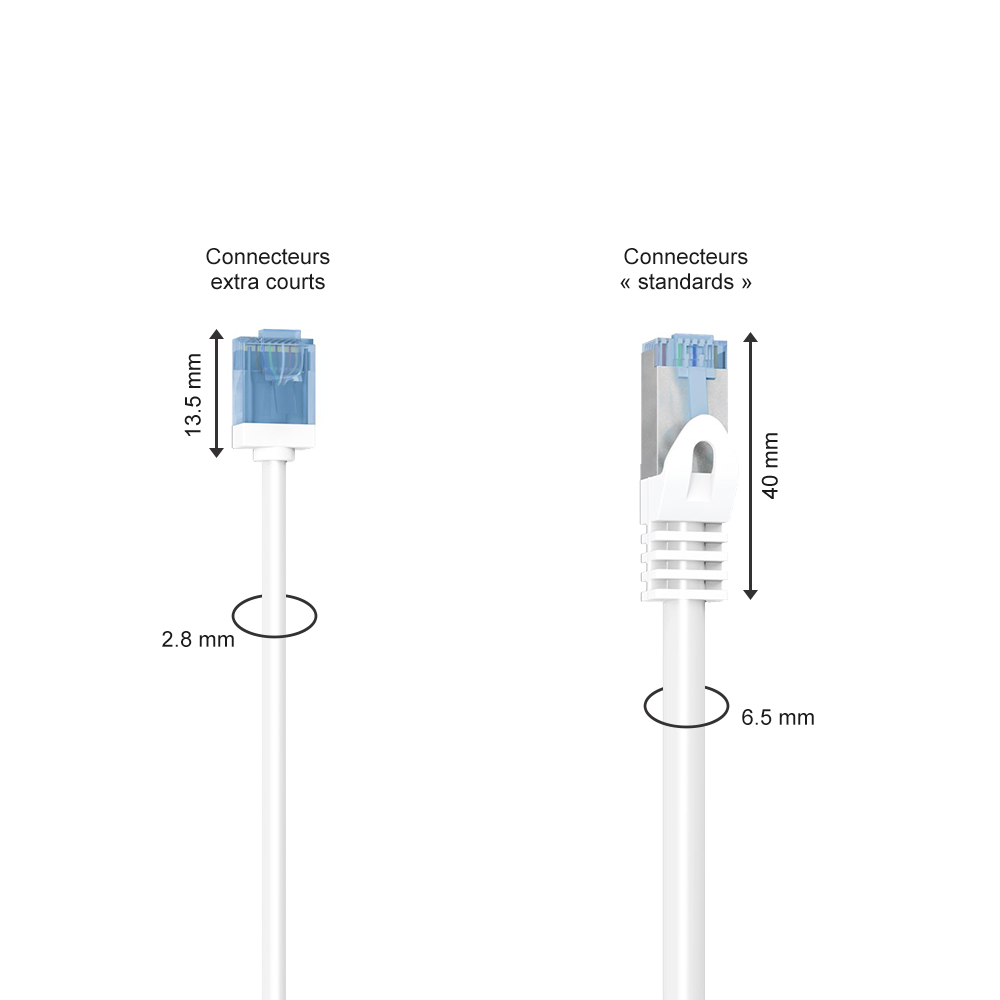 Câble Ethernet Cat 6a UTP LSOH slim / ultra flexible - gris 3mLes câbles réseaux superslim avec connecteurs extracourts réduisent drastiquement le volume de matériel dans les coffrets / baies informatique,les panneaux de brassage ou derrière un élément proche du mur - pour une circulation de l'air nettement améliorée et une accumulation de chaleur moins importante qu'avec un câblage traditionnel. De plus, la gaine en TPE souple et les conducteurs en cuivre minces assurent une flexibilité et une efficacité matérielle particulières qui font de cette génération de câbles le partenaire réseau parfait. Flexible à coup sûr : Sans blindage à paires torsadées et avec une gaine en TPE sans halogène et à faible dégagement de fumée pour un rayon de courbure particulièrement petit et une grande flexibilité Grâce à l'AWG 32 et à un diamètre extérieur de 3,8 mm, le câble est ultra-mince, mais aussi performant qu'un câble CAT standard Le câble réseau haute vitesse est parfait pour les réseaux Ethernet 10 Gigabit, rétrocompatible avec les anciennes générations en 100 Mbps ou 1000 Mbps (Gigabit). Le câble RJ45 convient pour Power over Ethernet (PoE, PoE+,) et HDBaseT La protection anti-pliage efficace et compacte est forte contre la rupture de câble et assure une longue durée de vie du câble Ethernet