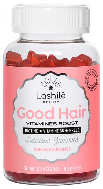 Lashilé Beauty Good Hair Vitamines Boost Cheveux Sublimes 60 Gummies est un complément alimentaire spécialement conçu pour contribuer à la pousse des cheveux et à leur beauté. Le zinc et la biotine contribuent au maintien de cheveux normaux, la vitamine B6 contribue à la synthèse normale de la cystéine, composant majoritaire des cheveux, le prêle aide à améliorer l'état des cheveux et des ongles, ainsi qu'à aider à la croissance et renforcement des cheveux. Goût tutti frutti. Sans gluten, sans gélatine, sans colorant artificiel. Vegan. Fabriqué en France.