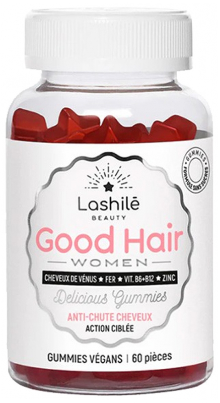 Lashilé Beauty Good Hair Women Anti-Chute 60 Gummies est un complément alimentaire conçu pour aider à prévenir la chute des cheveux. Les cheveux de Vénus aident à prévenir la chute des cheveux, le fer et la vitamine B12 jouent un rôle dans le processus de division cellulaire, le zinc et la vitamine B6 contribuent au maintien de cheveux normaux, la vitamine B6 contribue à la synthèse normale de la cystéine, la myrtille active la microcirculation du cuir chevelu. Goût fruits rouges. Sans gluten, sans gélatine ni produit laitier. Sans colorant artificiel. Vegan. Fabriqué en France.