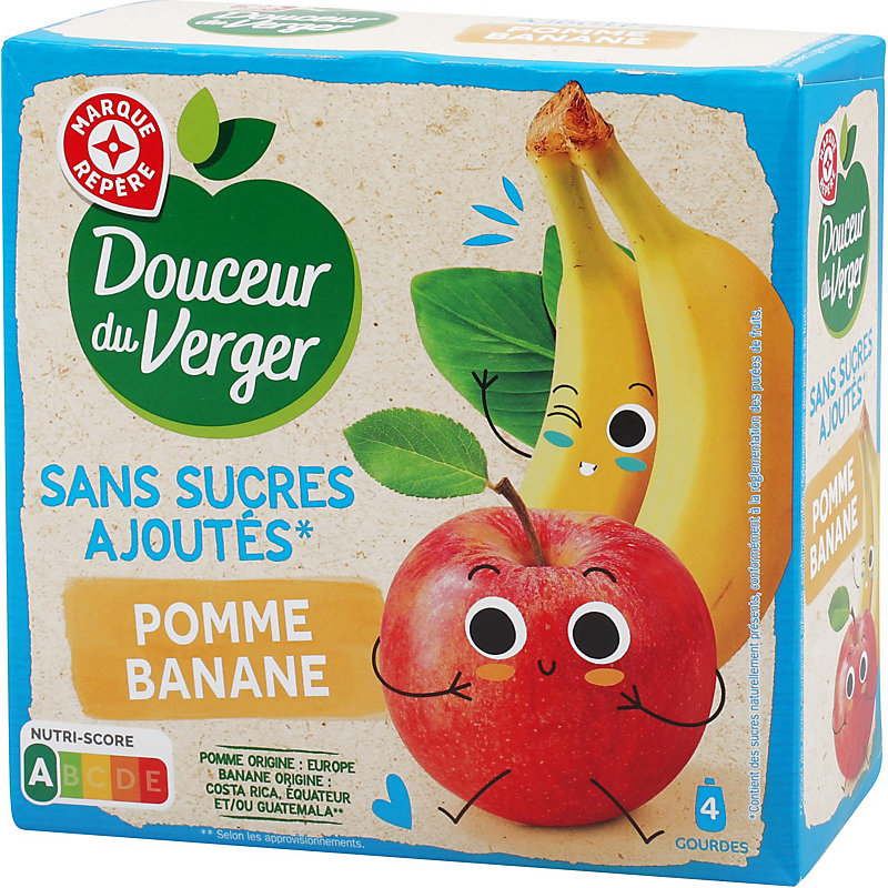 | Origine des principaux ingrédients | BANANE ORIGINE : COSTA RICA, EQUATEUR ET/OU GUATEMALA*, POMME ORIGINE : FRANCE * SELON LES APPROVISIONNEMENTS ET/OU LES CARACTÉRISTIQUES GUSTATIVES RECHERCHÉES |