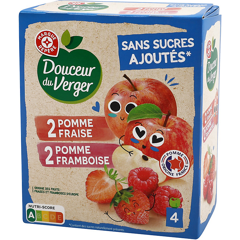 Ingrédients : Purée de pommes 75,9 %, purée de framboises 15 %, purée de pommes concentrée 7,9 %, purée de cassis, antioxydant : acide ascorbique.