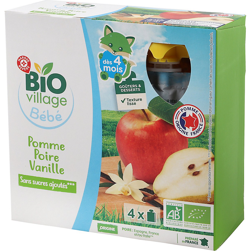 Aliment pour bébés : Purée de pommes et de poires, à la vanille - Produit issu de l'agriculture biologique BIO VILLAGE