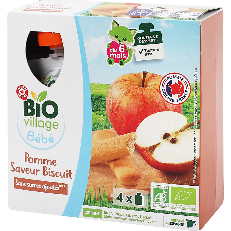 Gourdes sans sucres ajoutés pomme saveur biscuit dès 6 mois bio - 4 x 90 g - BIO VILLAGE
