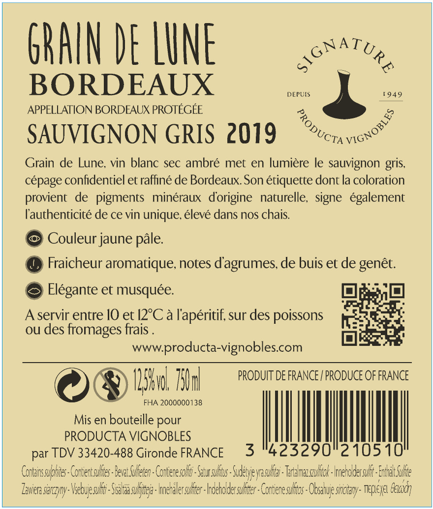 | Libellé | Grain de Lune, 2019 - Bordeaux AOC Sec - Blanc - 75 cl |
