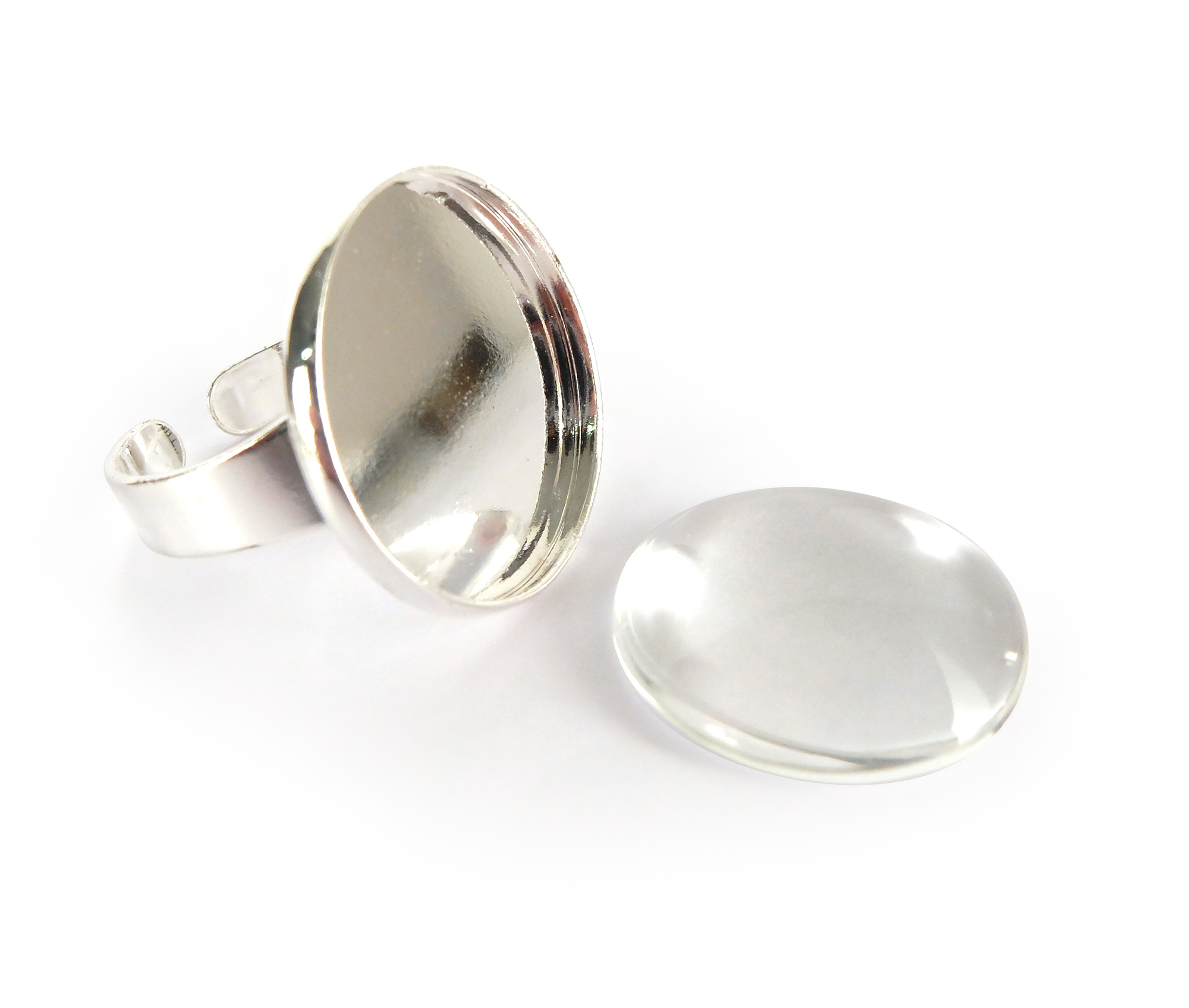 Bague à décorer + cabochon en verre. Idéal pour une déco avec du vernis, du tape ou de la FIMO en plaque fine. Argent - 20 x 20 mm.