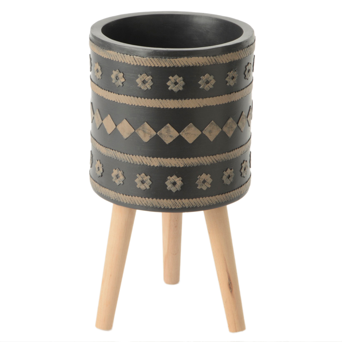 Grand cache pot sur pieds Magnésie et bois Dimensions de la partie cache pot : Hauteur 29.5 cm - Diamètre 30 cm Dimensions totales avec pieds : Hauteur 55 cm - Diamètre 30 cm