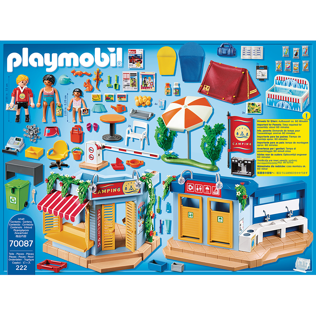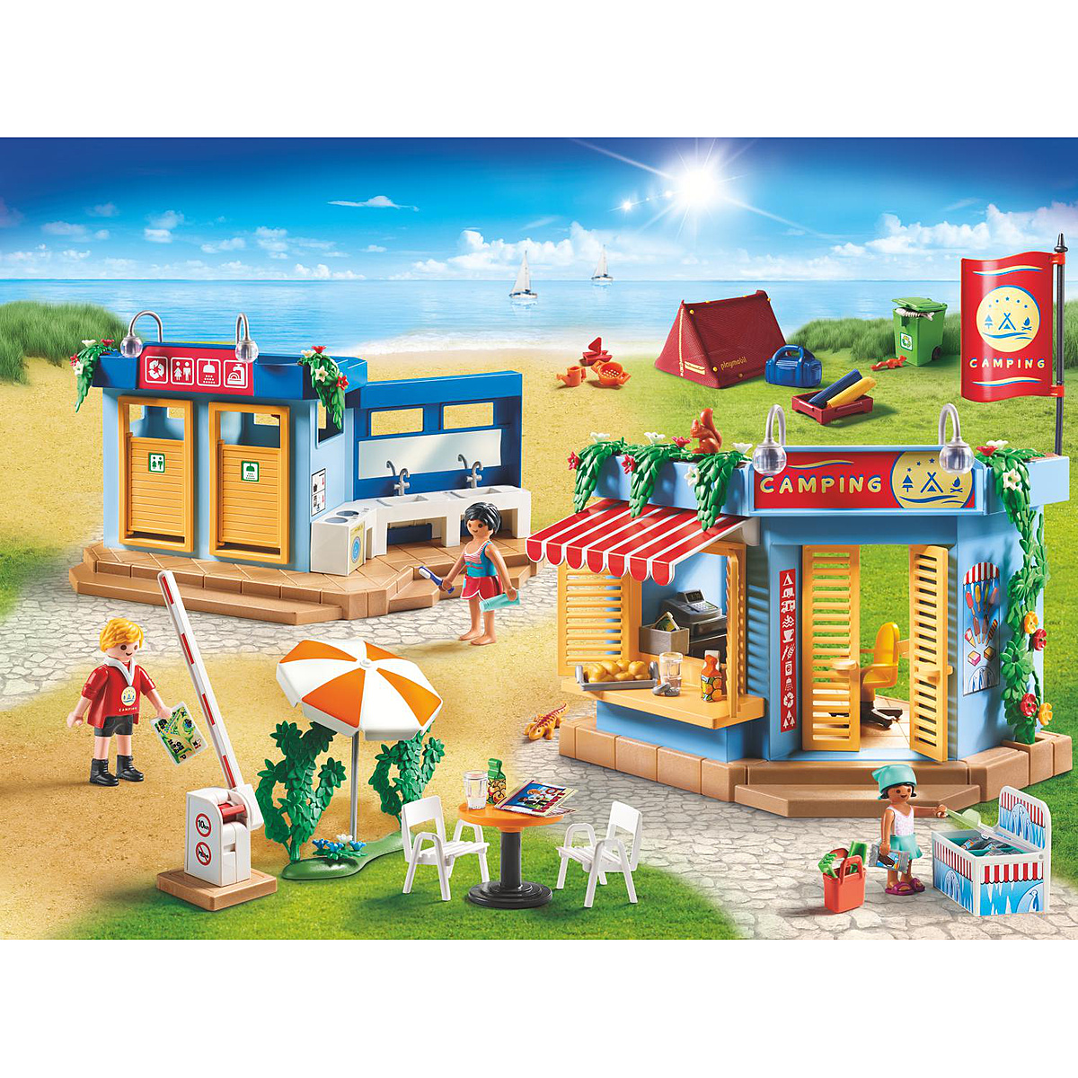 C'est enfin l'été ! Et si on allait au camping ? Avec réception et kiosque. Le bâtiment sanitaire est équipé d'une douche fonctionnelle. Comprend trois personnages et une tente.