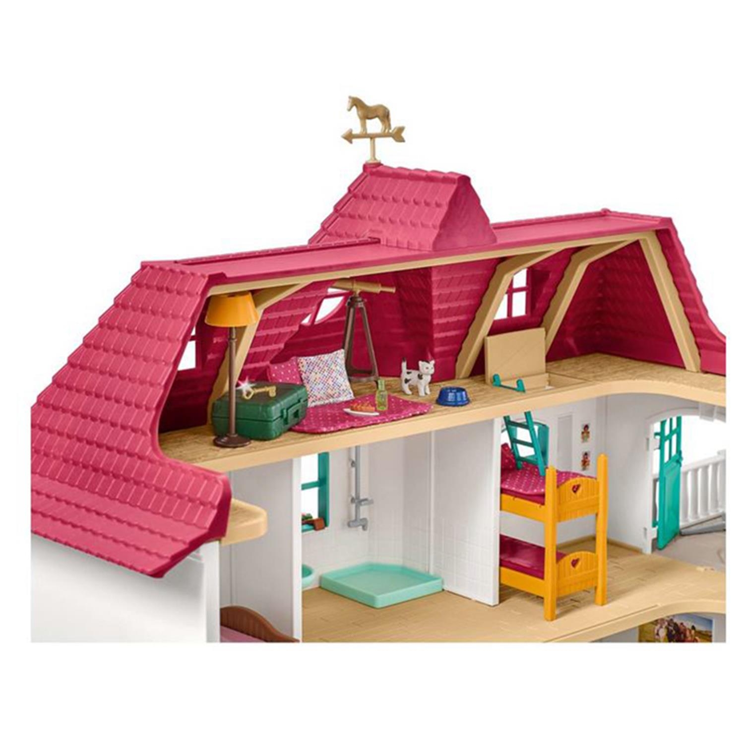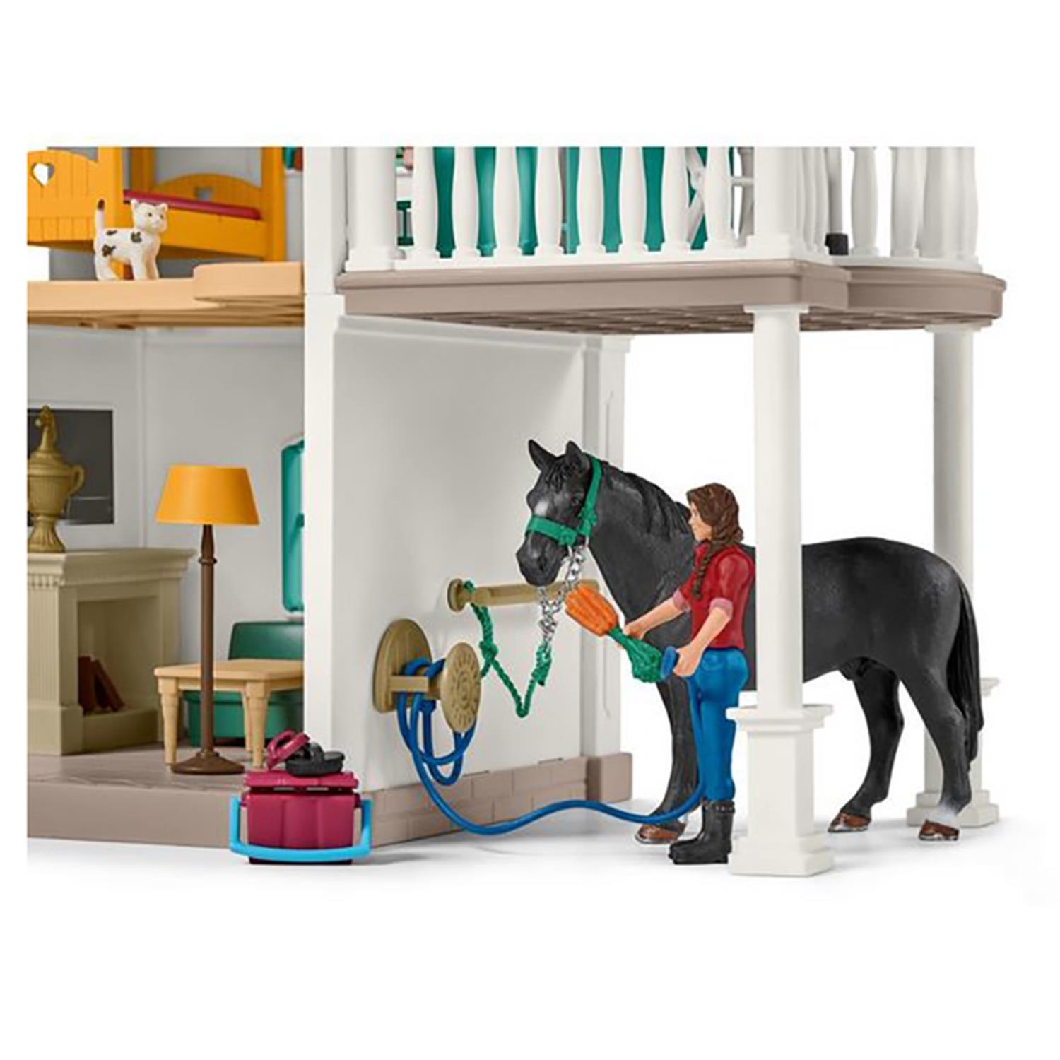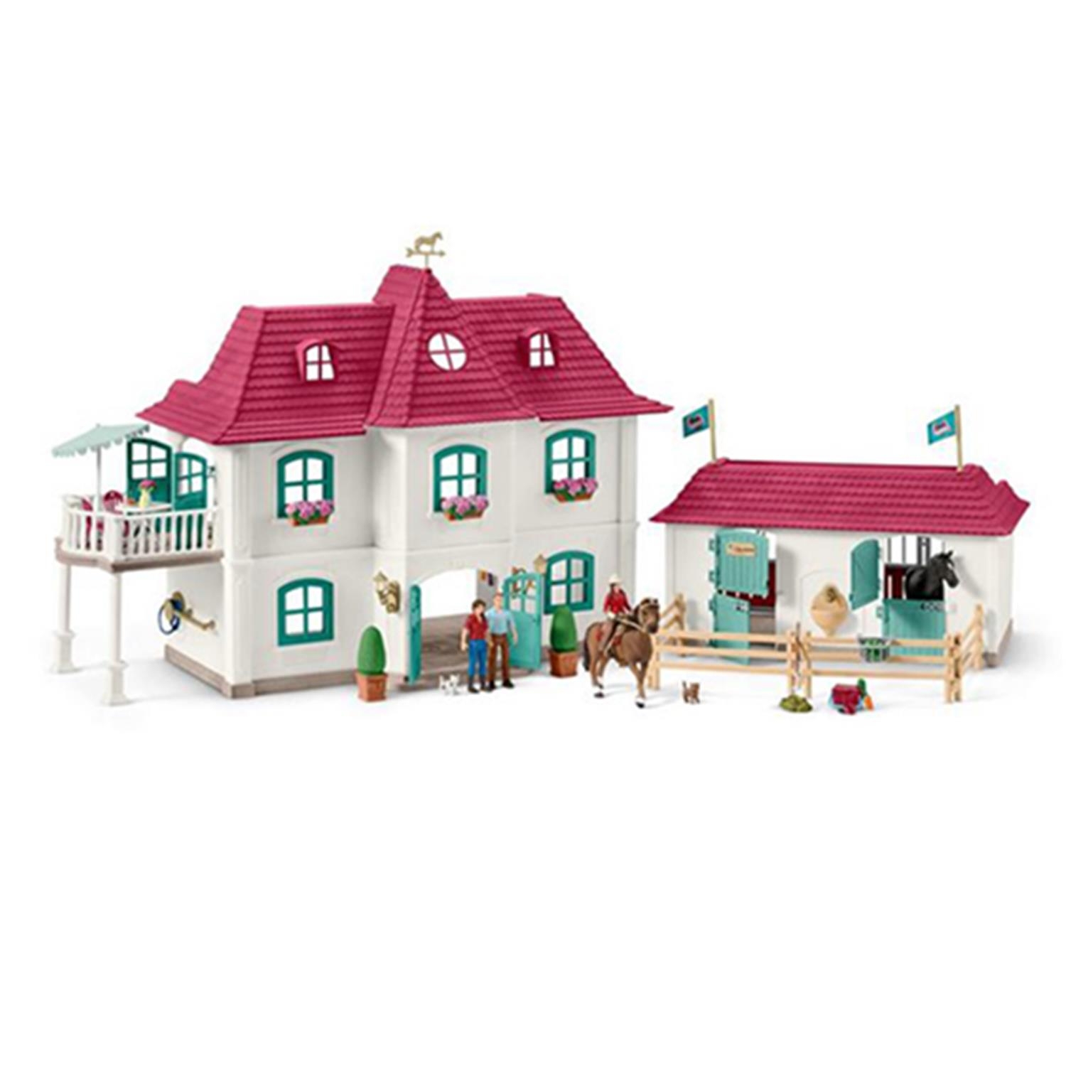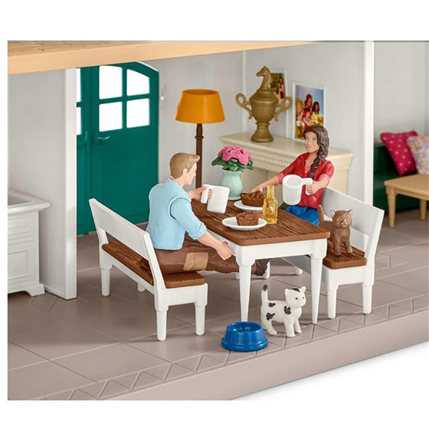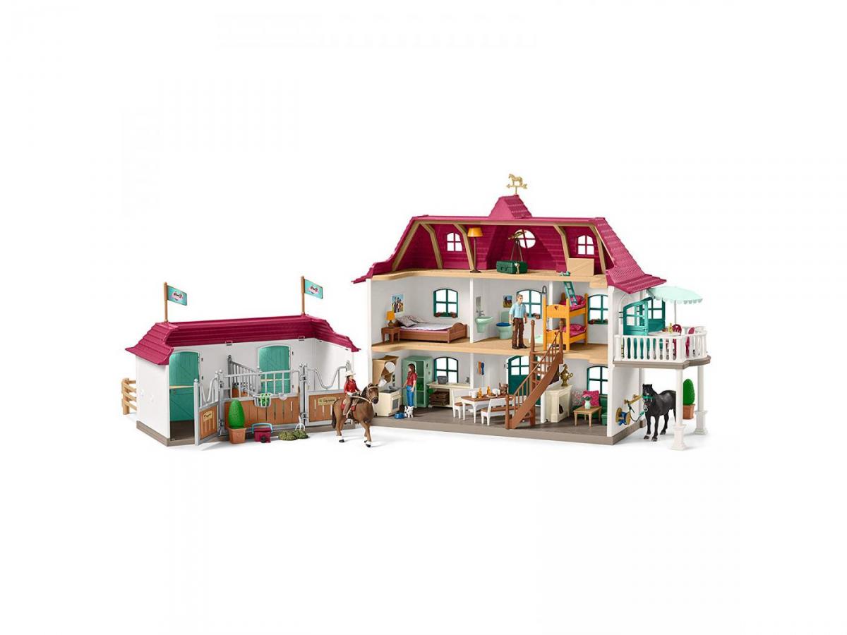 La vieille maison de campagne de Lakeside appartient depuis des générations à la famille Kramer. La vaste cuisine a toujours un thé bien chaud ou une bonne soupe sur le feu. Les escaliers conduisent au premier étage où Hannah et Mia se partagent une jolie chambre. Juste à côté de la maison se trouve l’écurie qui abrite le cheval Trakehner de Monsieur Kramer et du Quarter Horse de Hannah. Les figurines Schleich sont toutes sculptées avec des détails plein de réalisme, peintes avec amour pour des moments de jeu pédagogiques. Des figurines entièrement mobiles pouvant s’asseoir, monter à cheval, se tenir debout et tenir des objets ! Une porte secrète mène au grenier ! De nombreuses fonctionnalités de jeu et des pièces mobiles : les escaliers peuvent être décalés, la table pliée, le parasol basculé, les portes ouvertes et fermées et les accessoires tenus par les figurines ! Les chevaux peuvent être douchés à l’aide du tuyau.