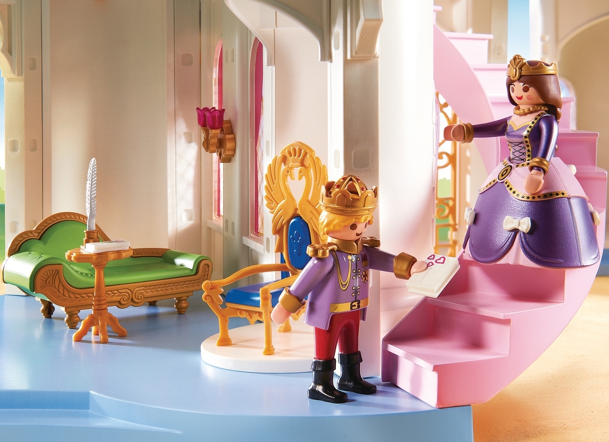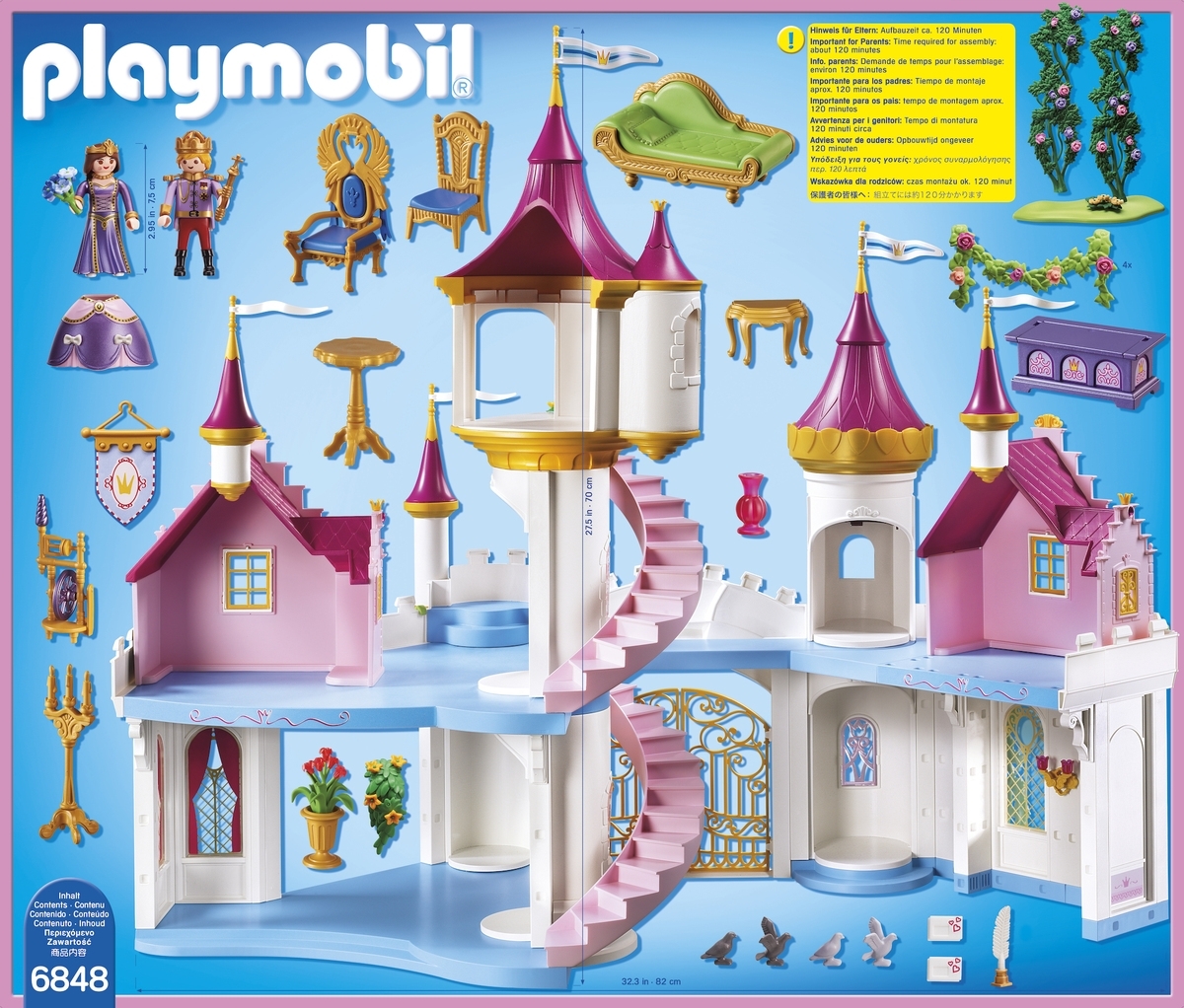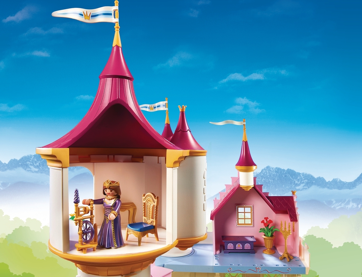 Château aux décors romantiques. L\'escalier mène à l\'étage et à la tour. La calèche royale avec cheval à coiffer (réf. 6856) passe sous le porche du château. Dimensions : 81 x 40 x 68 cm.