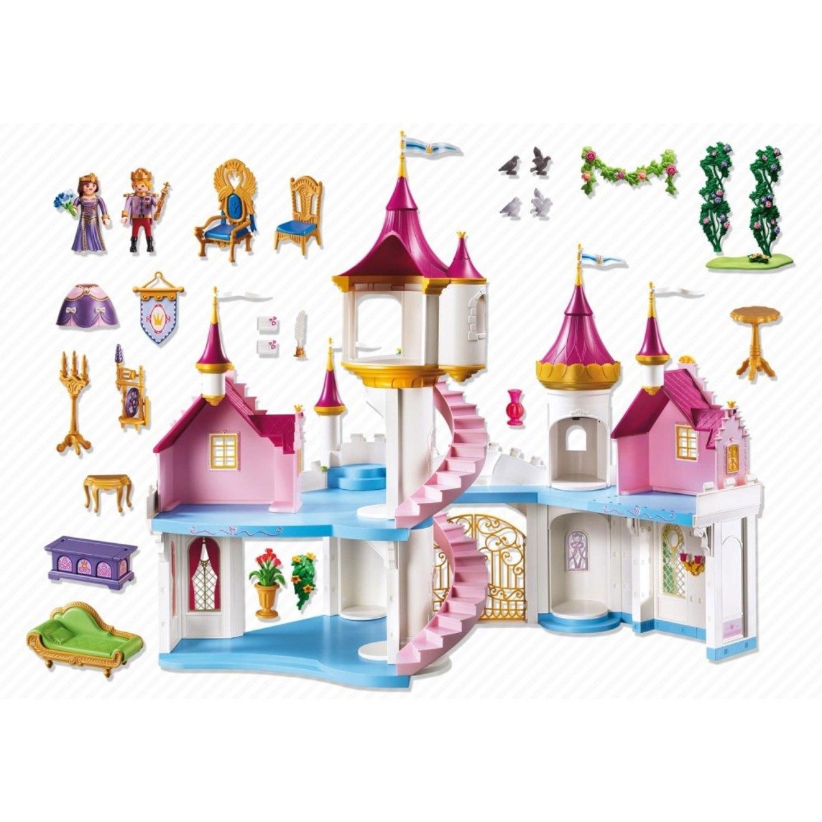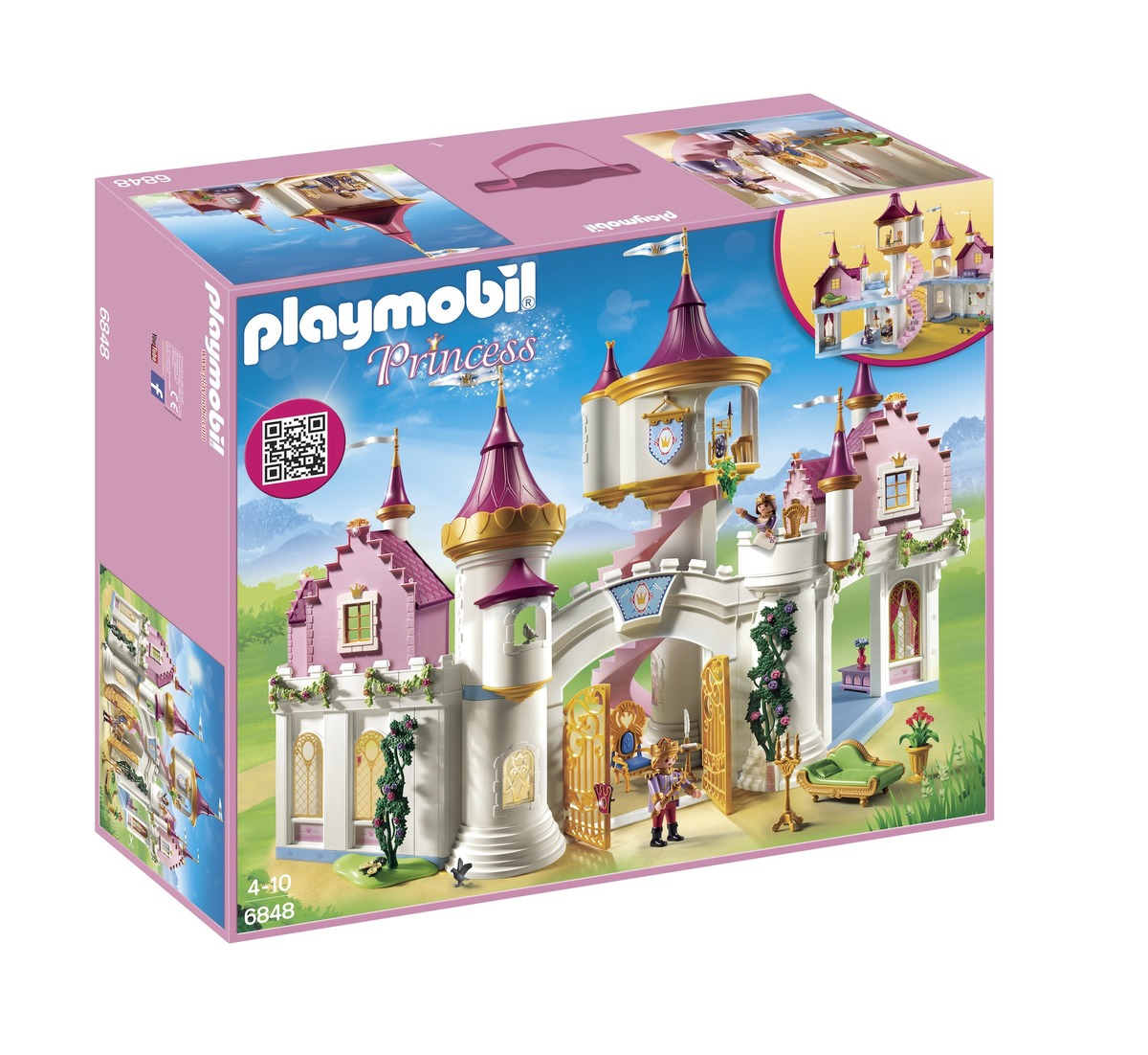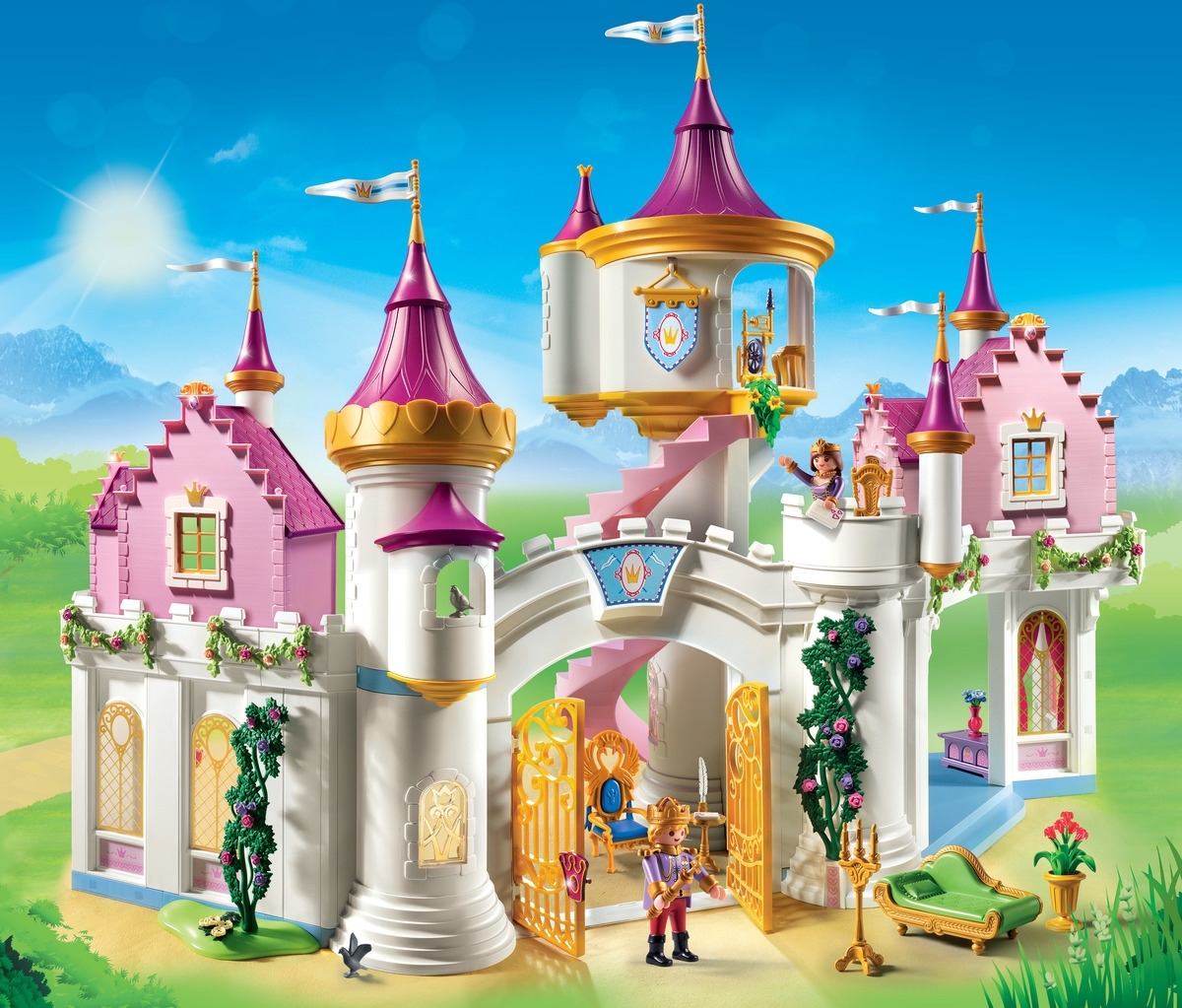 Château aux décors romantiques. L\'escalier mène à l\'étage et à la tour. La calèche royale avec cheval à coiffer (réf. 6856) passe sous le porche du château. Dimensions : 81 x 40 x 68 cm.