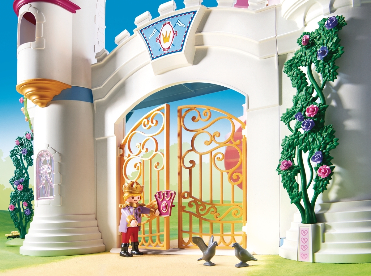 | Plus produit | - D\'un coté le château offre une façade délicatement décorée et de l\'autre est ouvert sur ses espaces intérieurs.\n- Avec de vraies fenêtres décorées de croisillons.\n- La porte à double battant s\'ouvre des deux cotés et se ferme avec un verrou.\n- La calèche royale avec cheval à coiffer (réf. 6856) passe sous le porche du château.\n- Des guirlandes de roses ornent les pignons ainsi que la porte.\n- Le château peut être aménagé avec les pièces réfs. 6850 à 6855.\n\n |