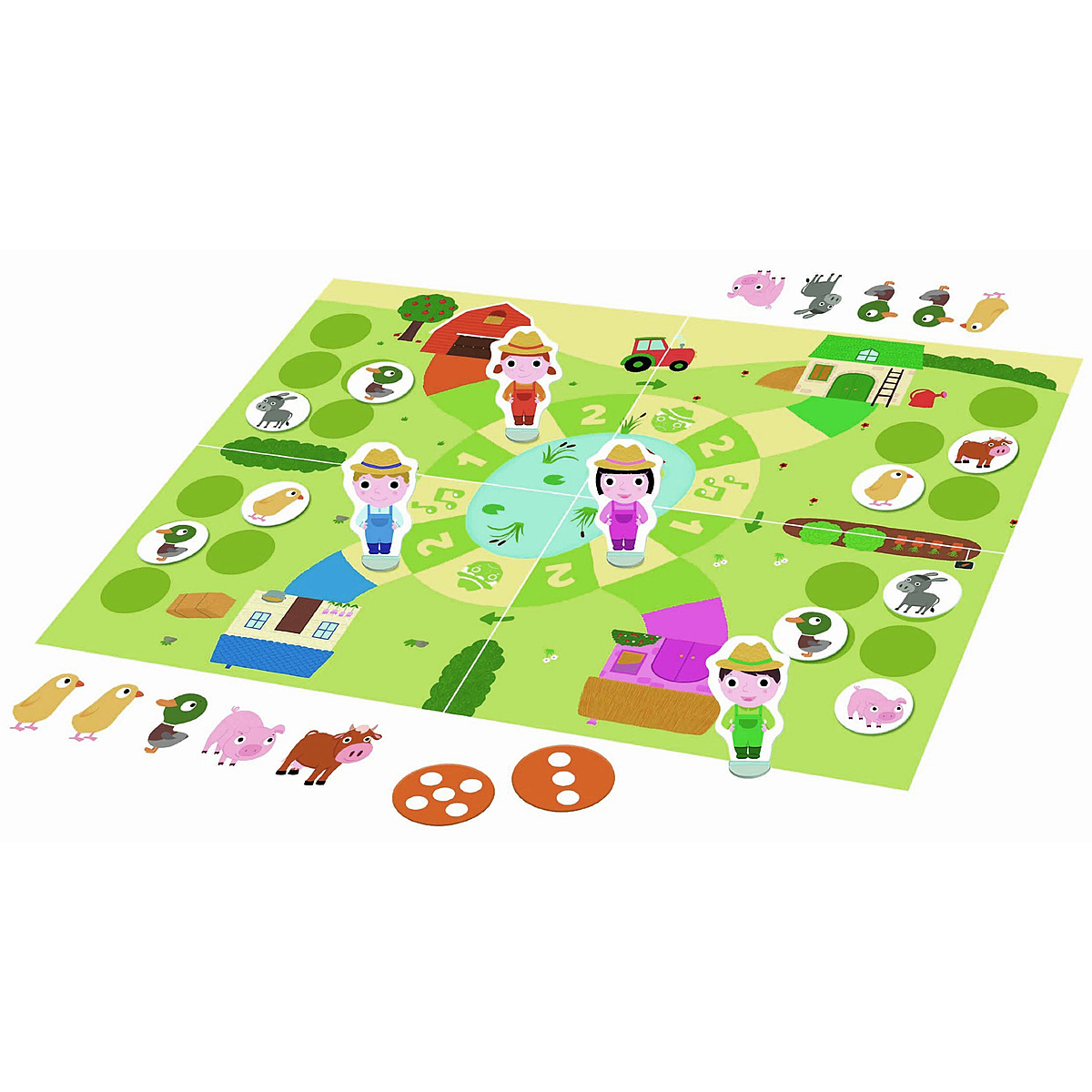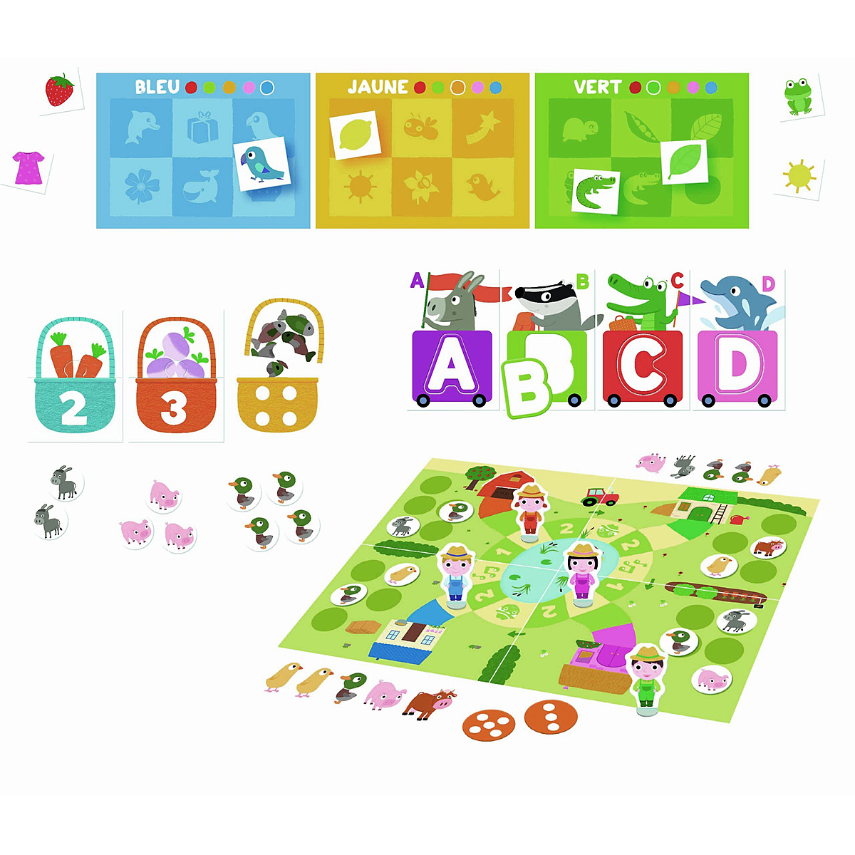 Plus de 10 jeux progressifs pour jouer seul et apprendre à jouer ensemble: le loto des couleurs, le petit train des lettres, le jeu des 5 paniers (chiffres et quantités). Et pour jouer tous ensemble: le grand jeu de la ferme. Qui sera le premier à mettre tous ses animaux dans son enclos?
