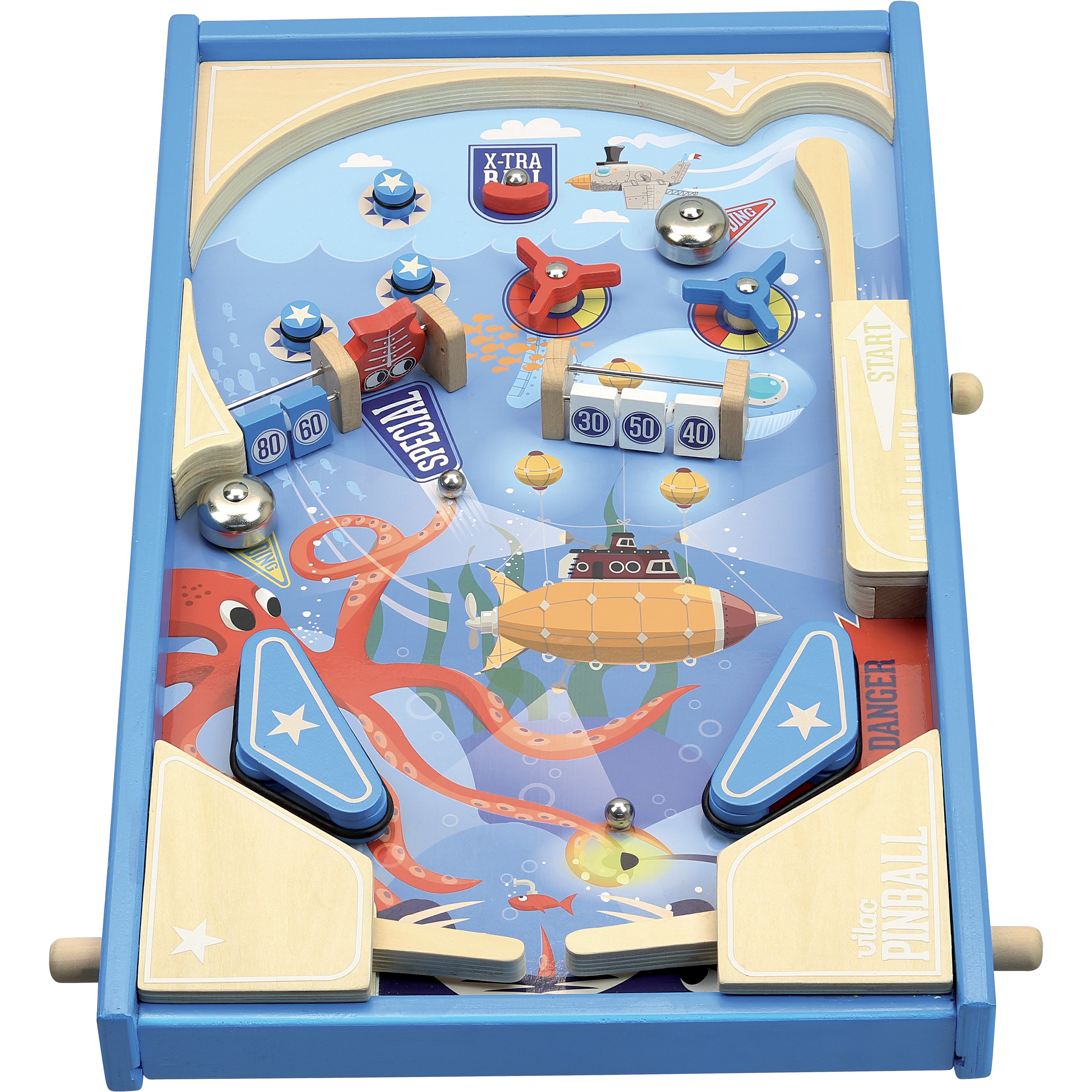 Comme les grands ! Ce flipper en bois à poser est livré avec 3 billes en métal pour dégommer les cibles, actionner les clochettes, emporter les tourniquets… Marquez le plus de points et remportez la bataille sous la mer. Pieds en bois amovibles. A partir de 5 ans.