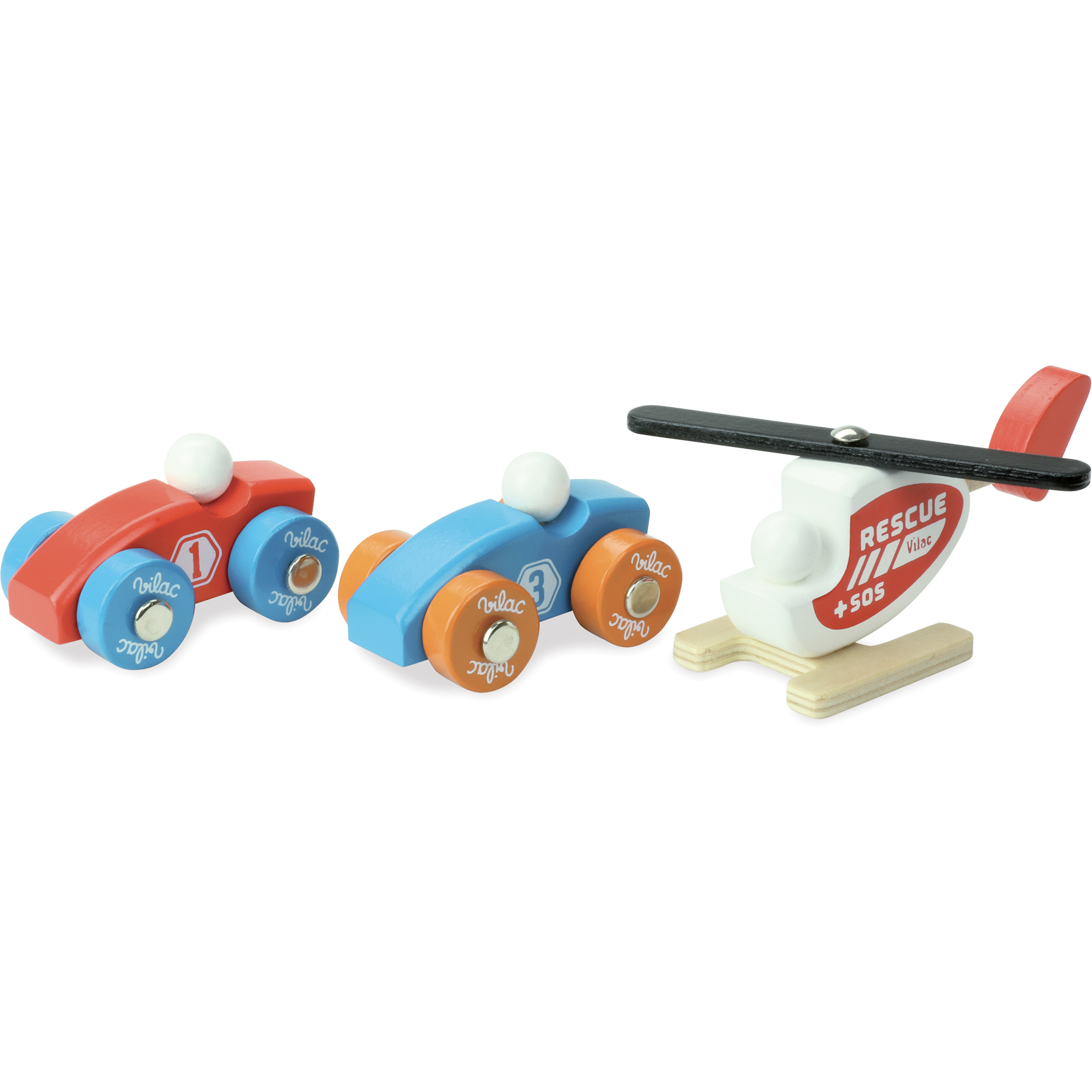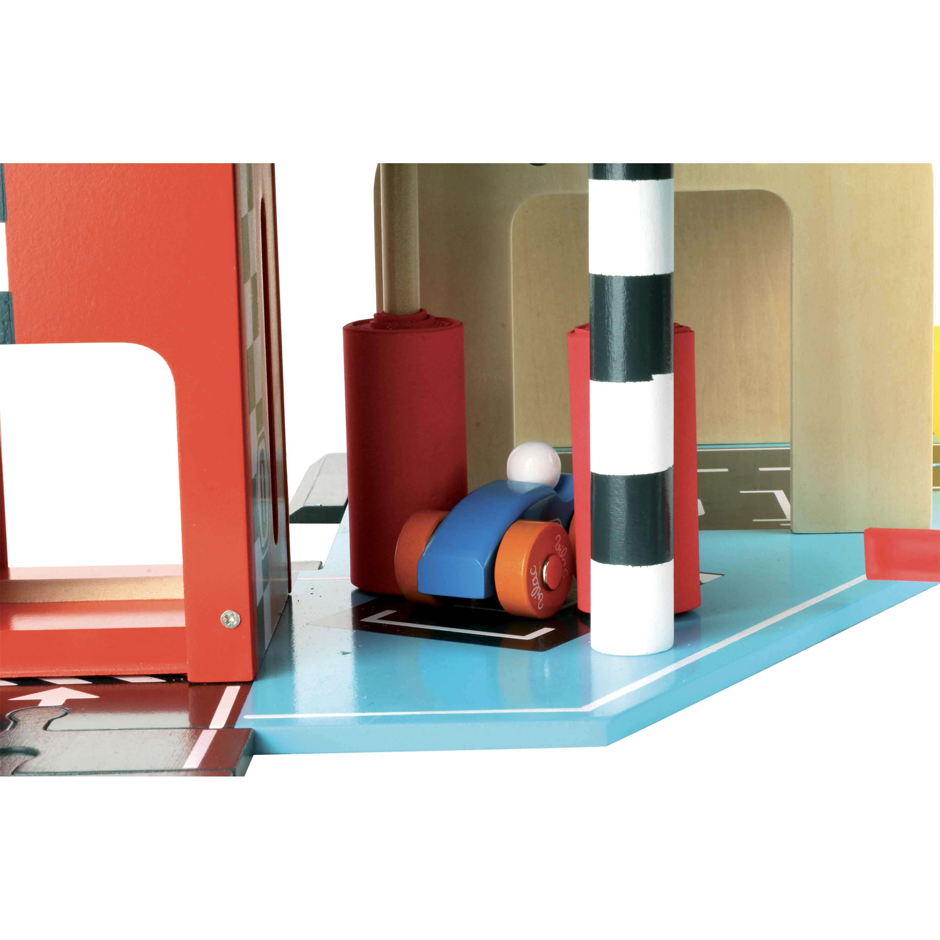 Un grand garage bleu avec ascenseur, porte déployante, rouleaux de lavomatic, barrière de parking, rampes en plastique et tremplin et ses accessoires en bois (2 voitures, un hélicoptère et panneaux de signalisation). Ce garage fait partie de la collection Vilacity et est compatible avec le petit circuit, le grand circuit et la station d'essence vilacity.