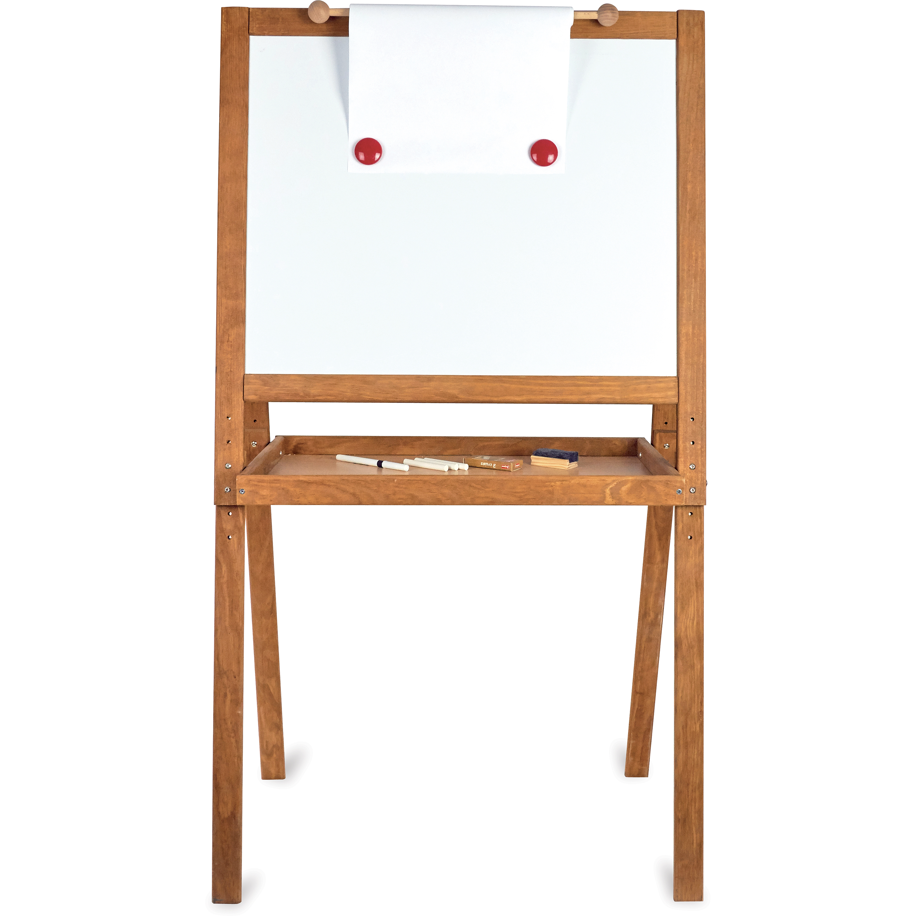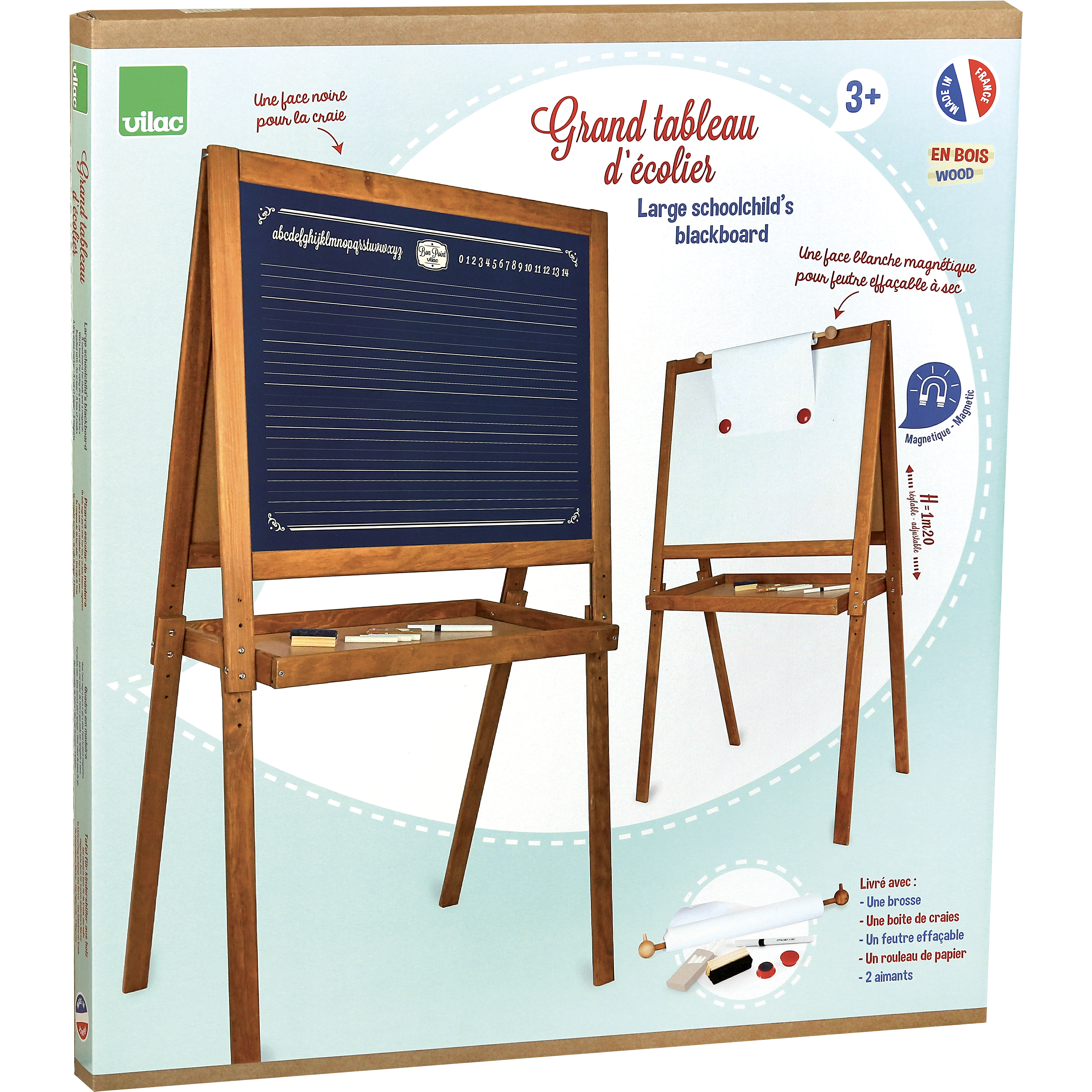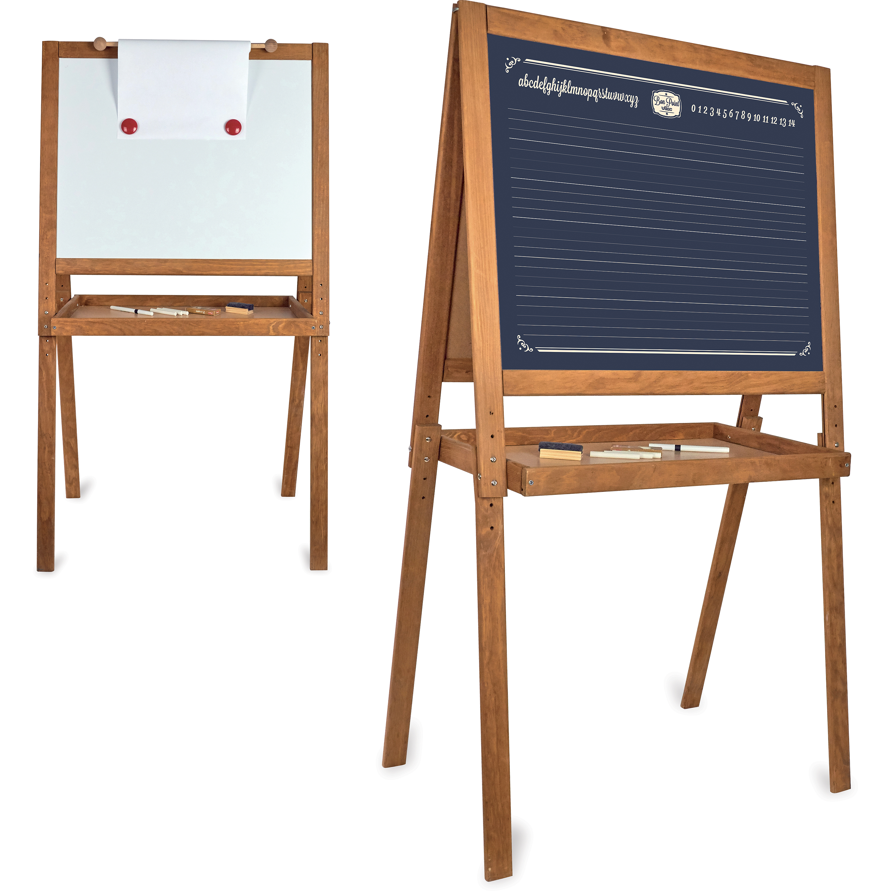 Un grand tableau en bois sur pied avec une face pour écrire à la craie sur les lignes et une autre face blanche magnétique pour feutres et aimants. Ce tableau est doté également d'un rouleau de papier pour dessiner. Livré avec rouleau de papier, magnets, brosse à tableau, craies et feutres.