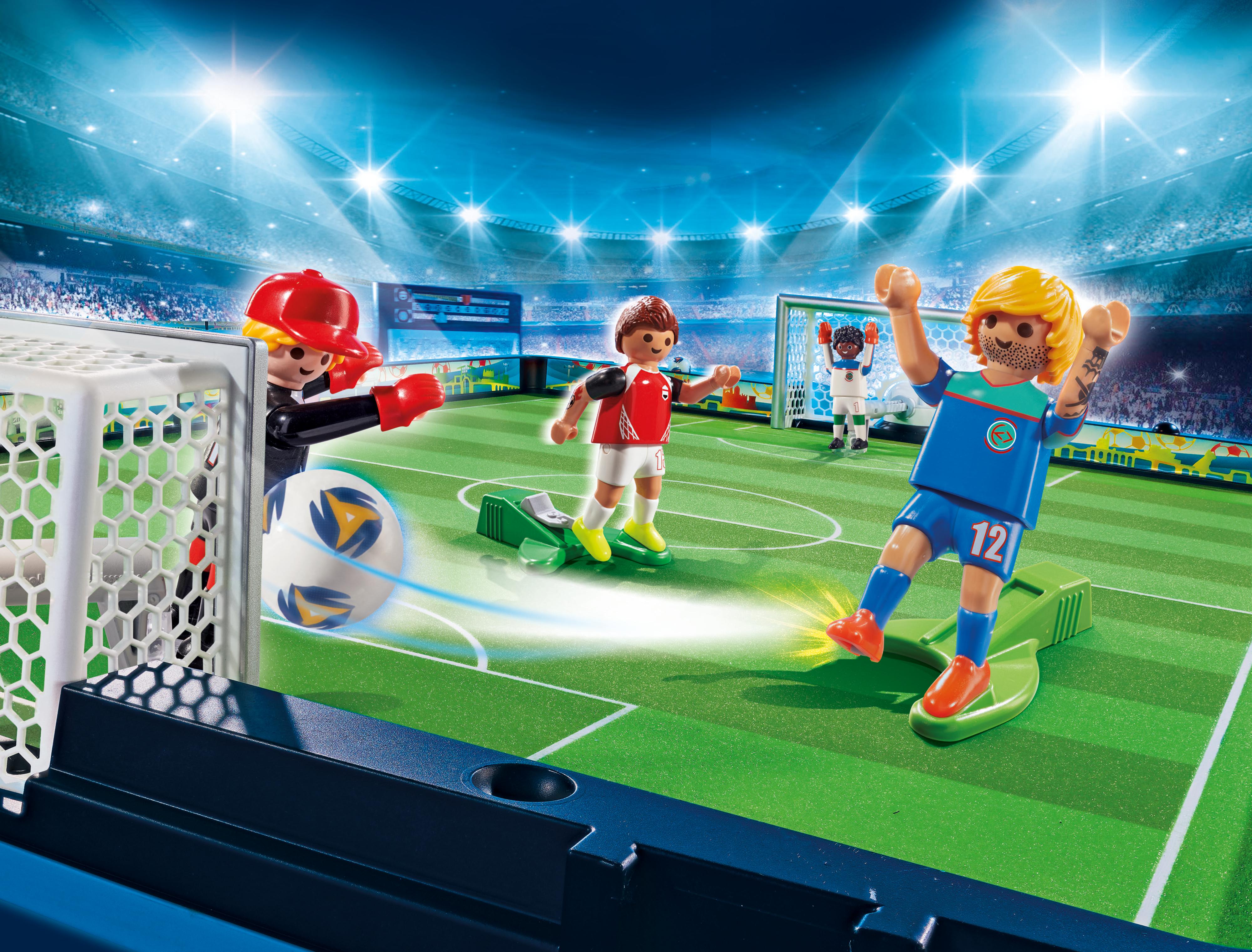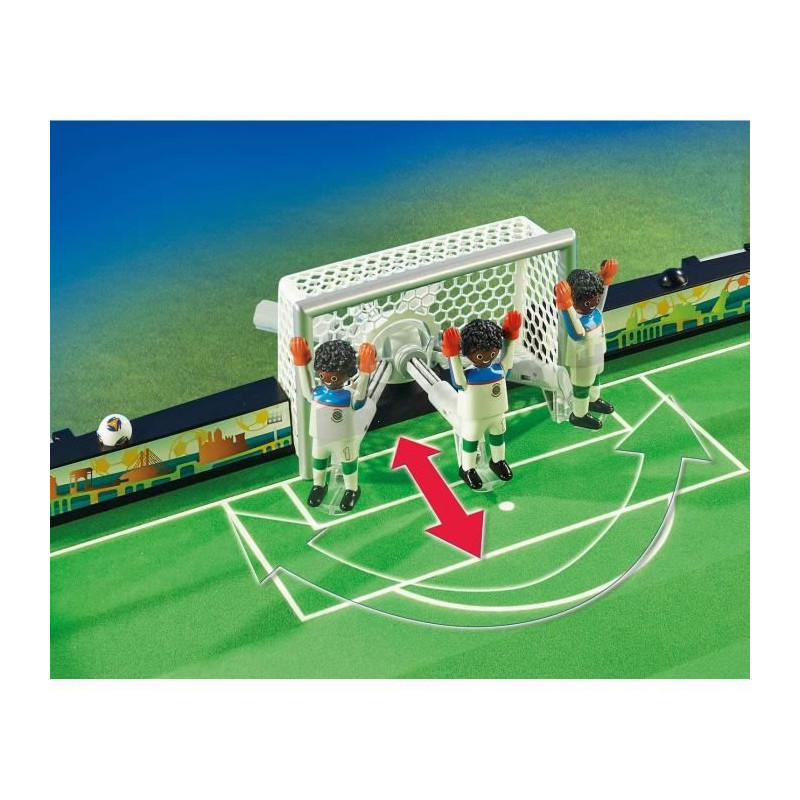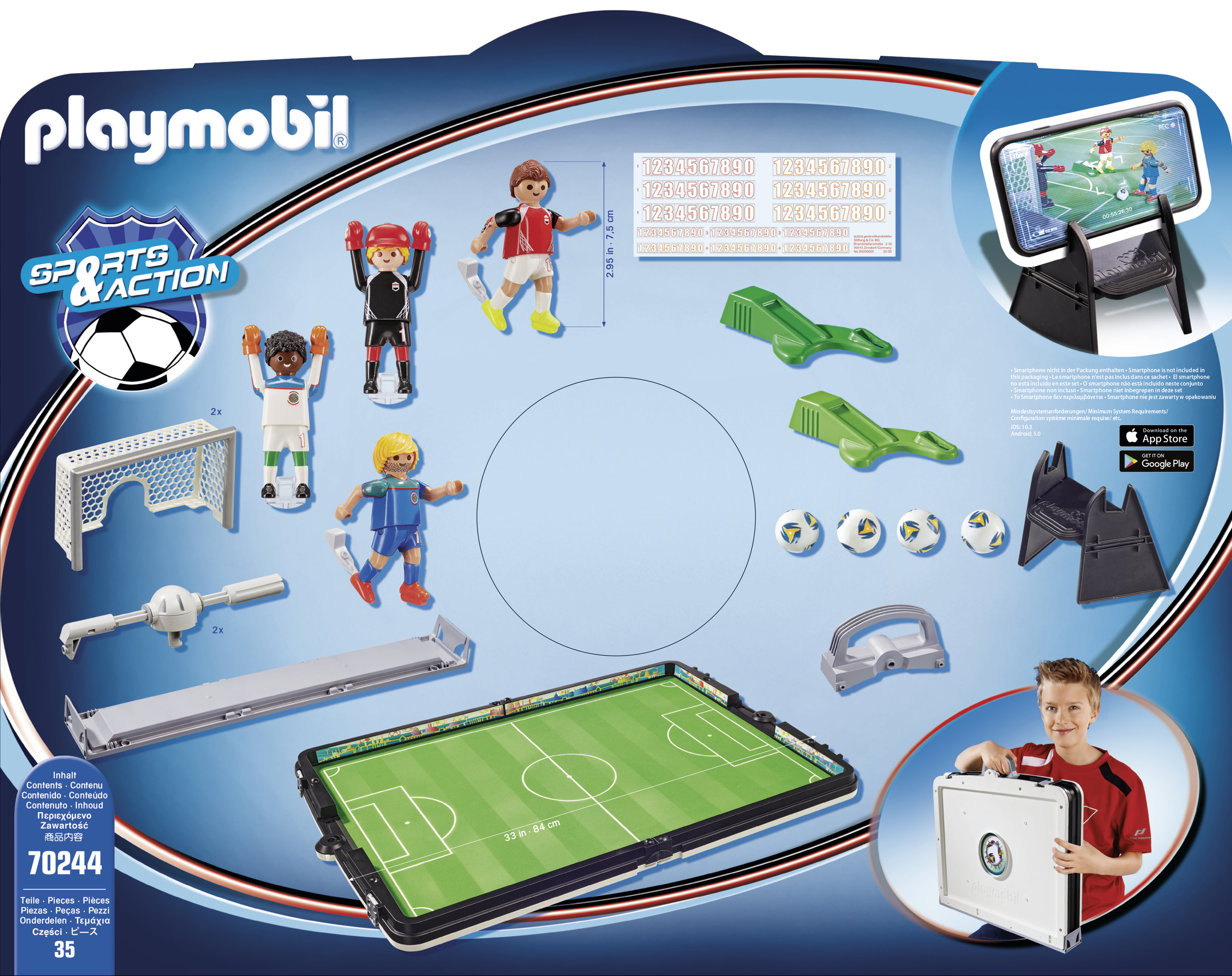 | Plus produit | - La mallette se transforme en terrain de jeu. -Joueur de football avec fonction de tir à une main. - Les deux gardiens de but peuvent être pivotés à gauche et à droite et peuvent être déplacés du but. - Contient une feuille d\'autocollants avec les numéros des joueurs pour le dos et le pantalon. - Avec l\'application PLAYMOBIL qui permet de recréer une véritable ambiance de stade. |