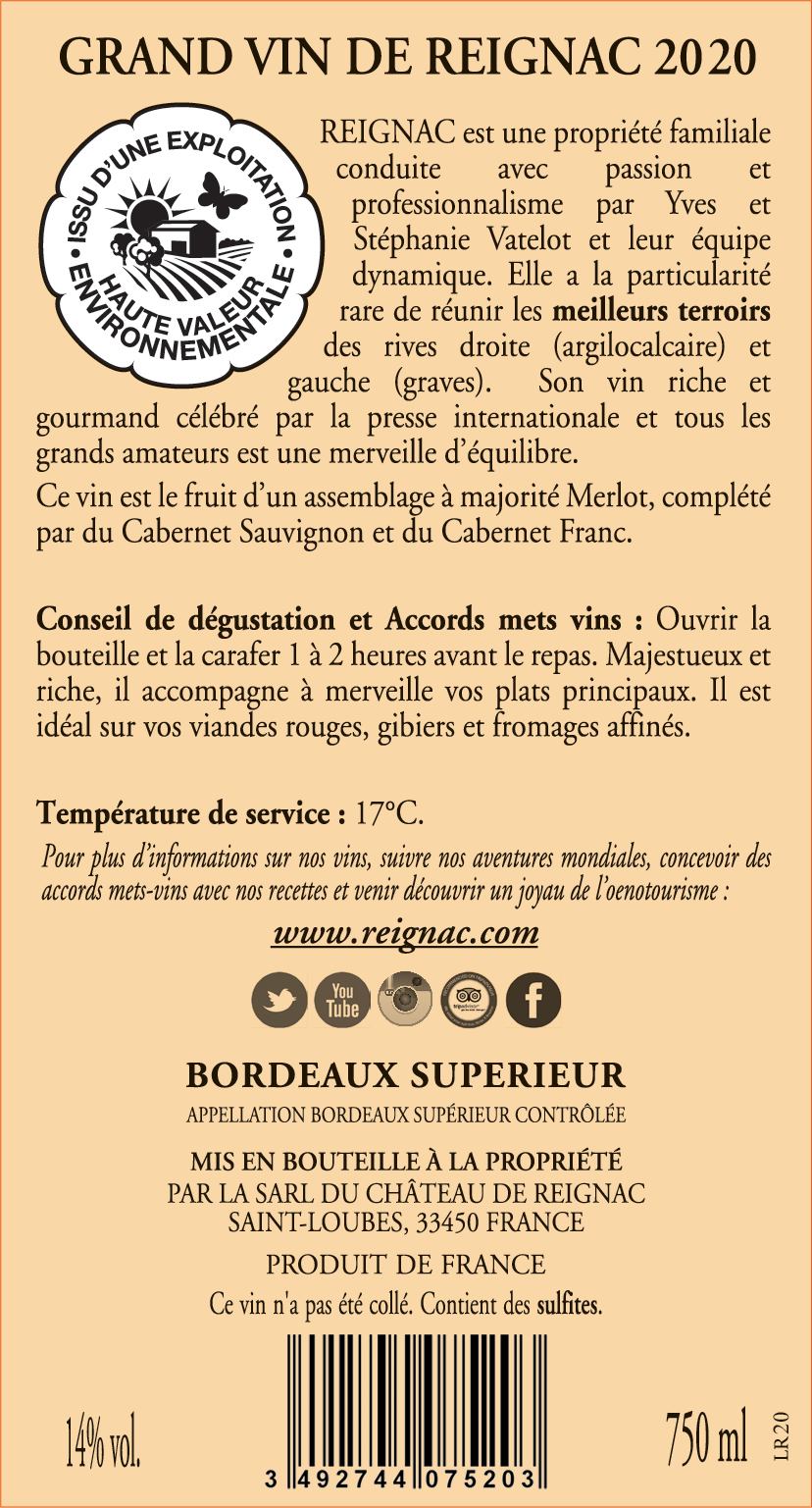 | Libellé | Grand Vin De Reignac, 2020 - Bordeaux Supérieur AOP - Rouge - 75 cl |