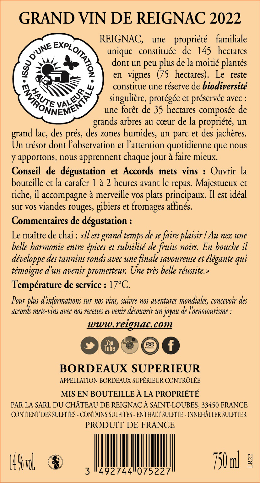 | Libellé | Grand Vin de Reignac , 2022 - Bordeaux Supérieur AOP - Rouge - 75 cl |