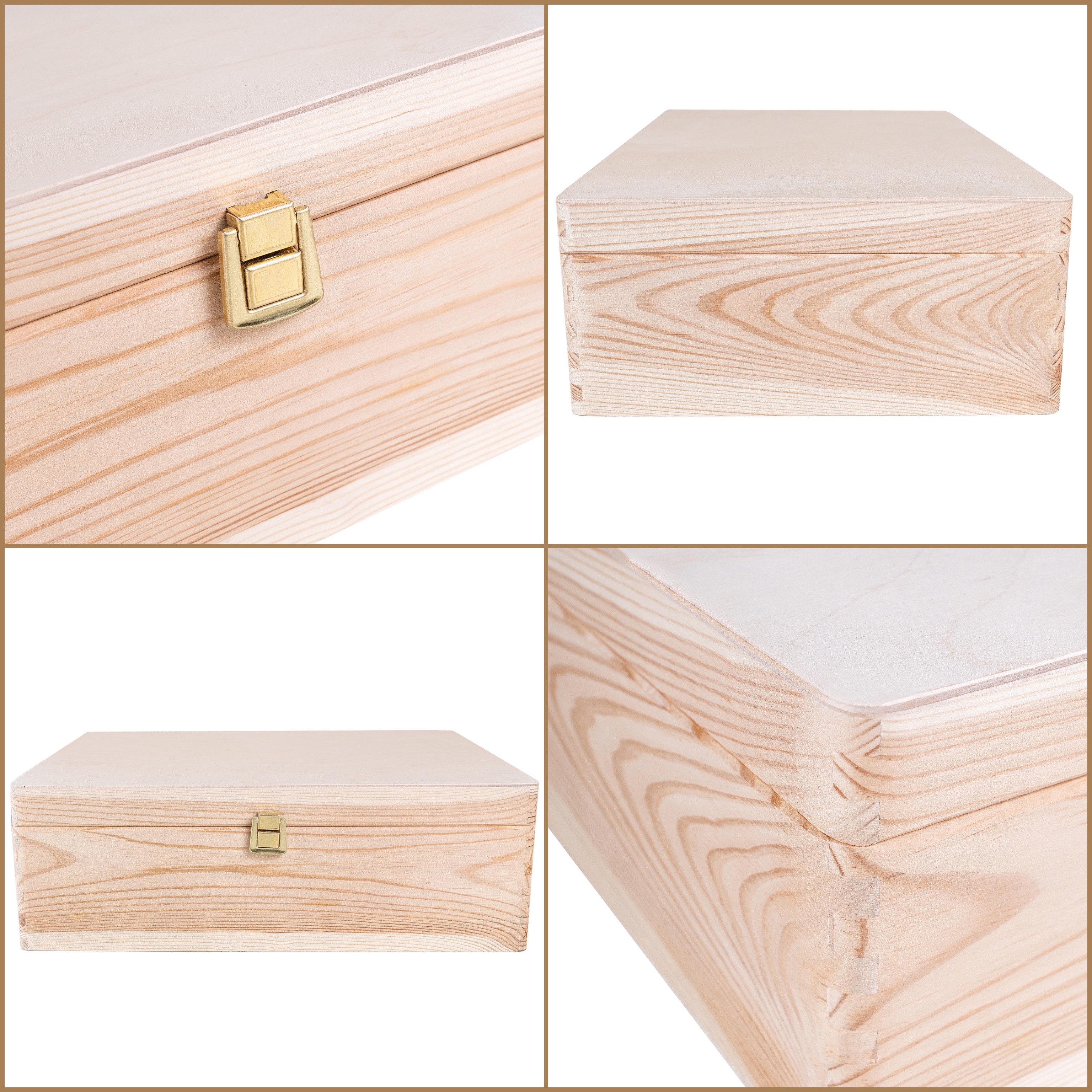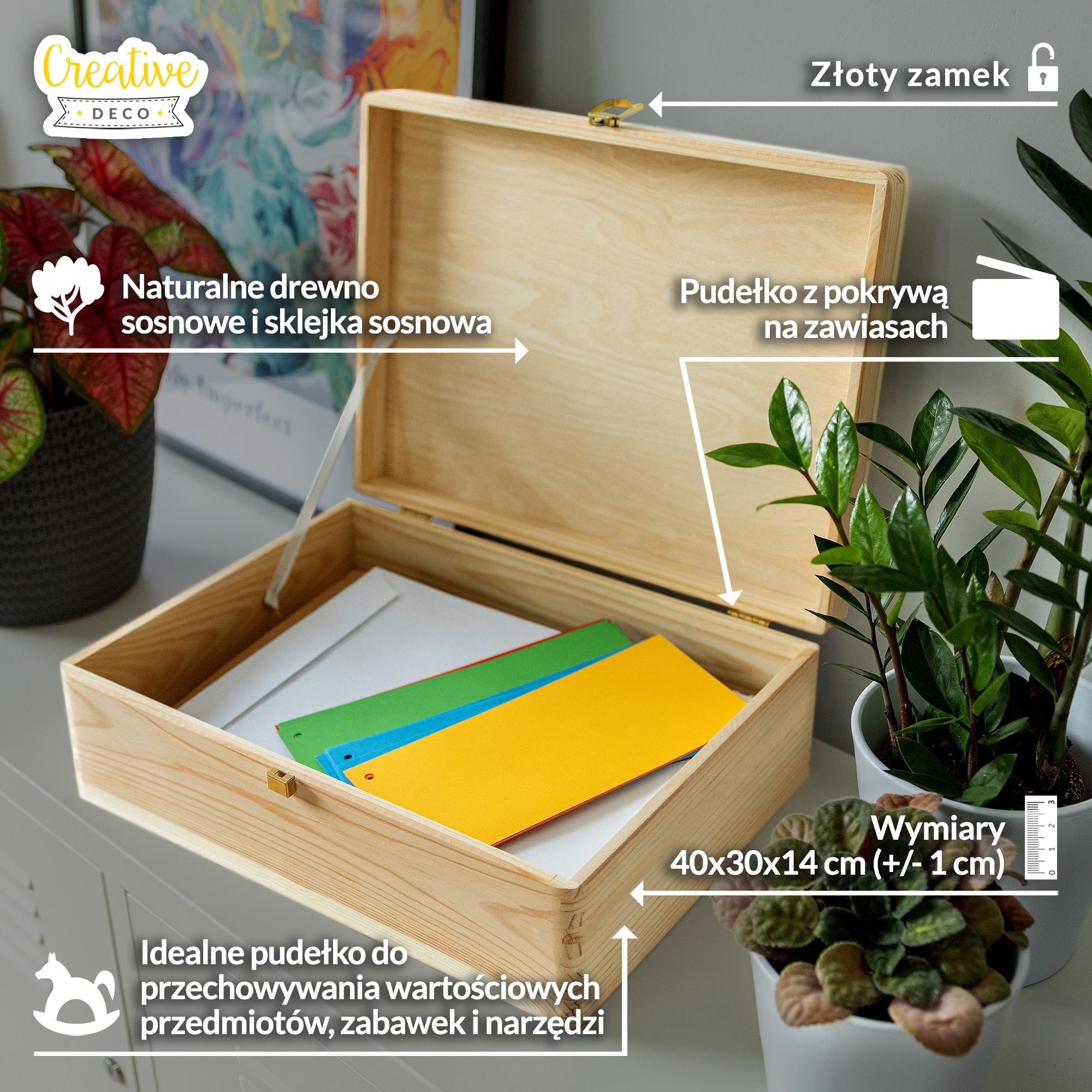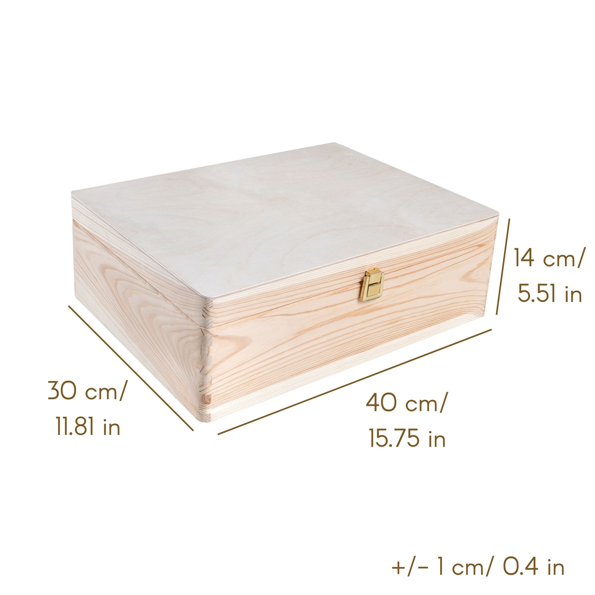 TAILLE PARFAITE – Avec des dimensions : externe de 40 x 30 x 14 cm et interne de 37,5 x 27,5 x 9,8 cm, ce coffre est parfait pour stocker et ranger tous les documents, les objets de valeur, les jouets, les vêtements, les accessoires et les bijoux. Idéal pour le cadeau d’anniversaire, de baptême, de Noël, de Pâques, ou de souvenir. PARFAIT POUR TOUS LES ÂGES - Bords arrondis non tranchants qui le rendent sécuritaire à utiliser pour tous les âges comme les enfants, les adolescentes ou les adultes ! Parfait pour le découpage, le bricolage, la teinture, le vernissage, la pyrogravure, l'artisanat, la présentation des produits et d'autres projets ! GRANDE QUALITÉ – Léger avec une épaisseur de paroi de 1 cm + base en contreplaqué de 3 mm. L'odeur de bois qui vient dans l'emballage vous donne l'impression d'utiliser du bois certifié qui provient des forêts durables des Carpates. ORGANISATION D’ESPACE – Vous voulez créer un produit selon vos besoins et vos goûts ? Vous pouvez modifier la boite comme vous voulez en mettant des diviseurs et séparateurs à l'intérieur et en profitant l’organisation d’espace !