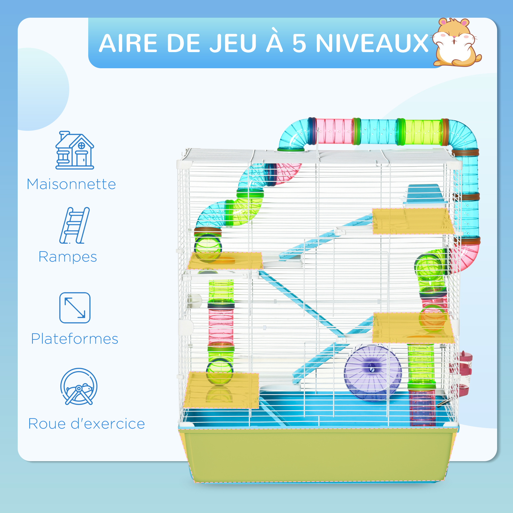 Libellé Grande cage à hamsters 5 niveaux - tunnels, abreuvoir, roue, maisonnette, échelles - dim. 59L x 36l x 69H cm - métal PP bleu blanc