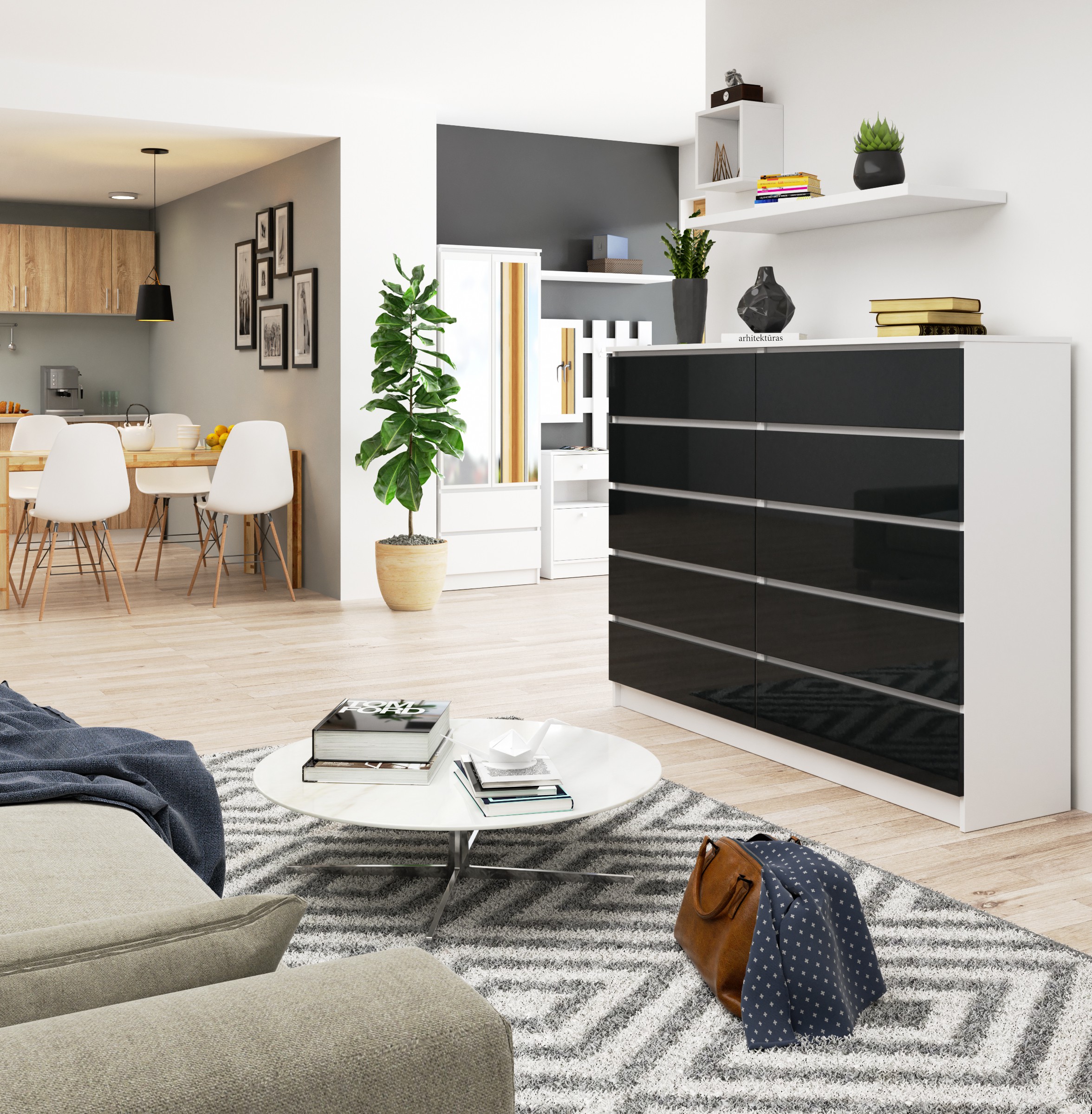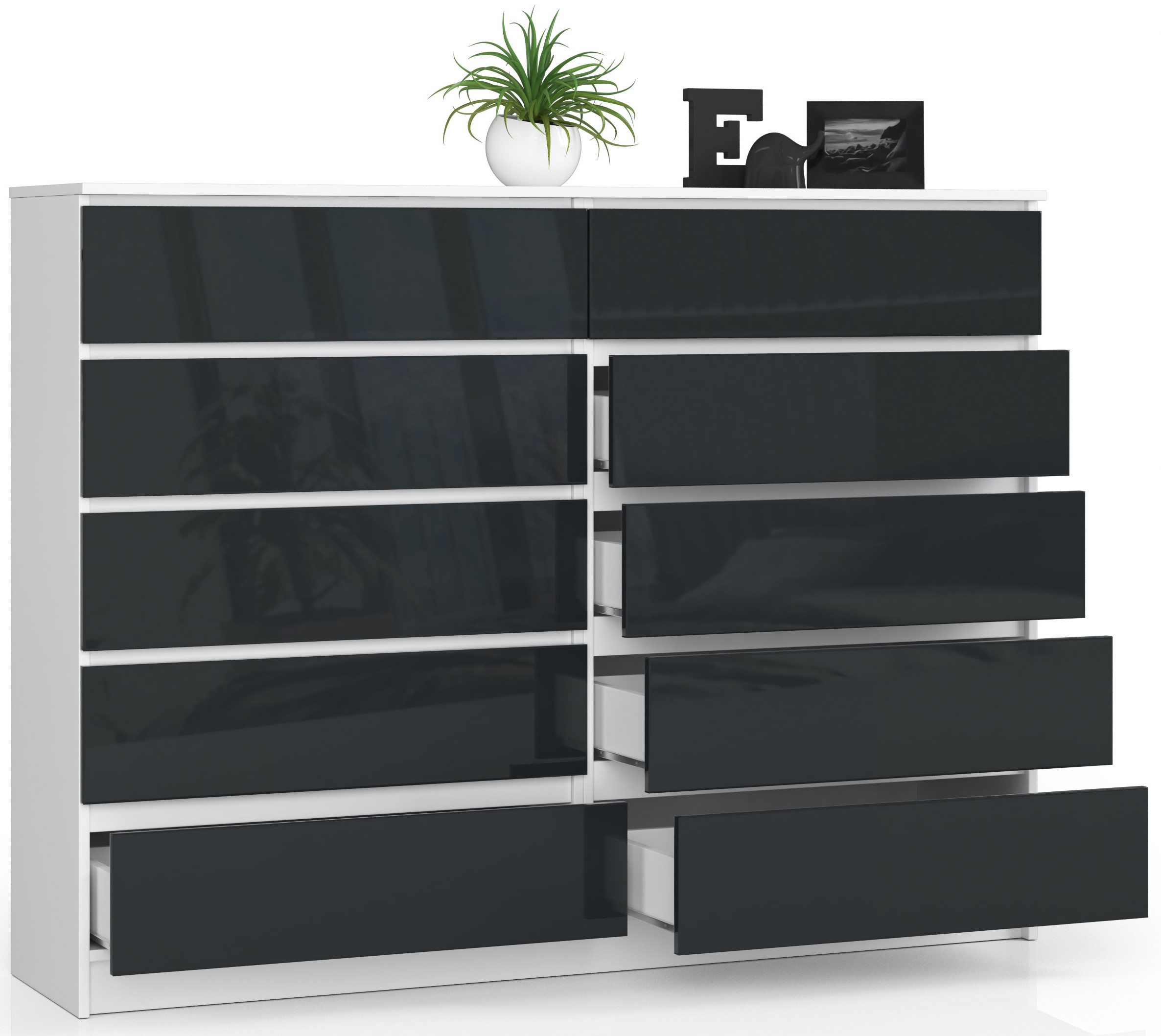 Grande Commode pour le salon AKORD K160 Blanche 160 cm 10 tiroirs façade Graphite Brillant 160x40x121 cm