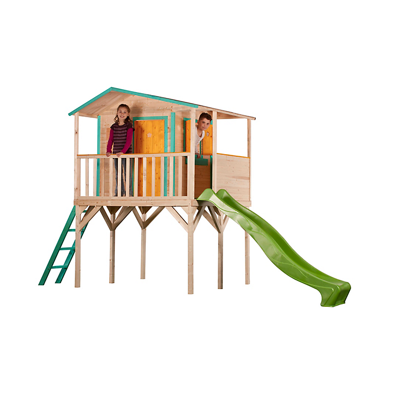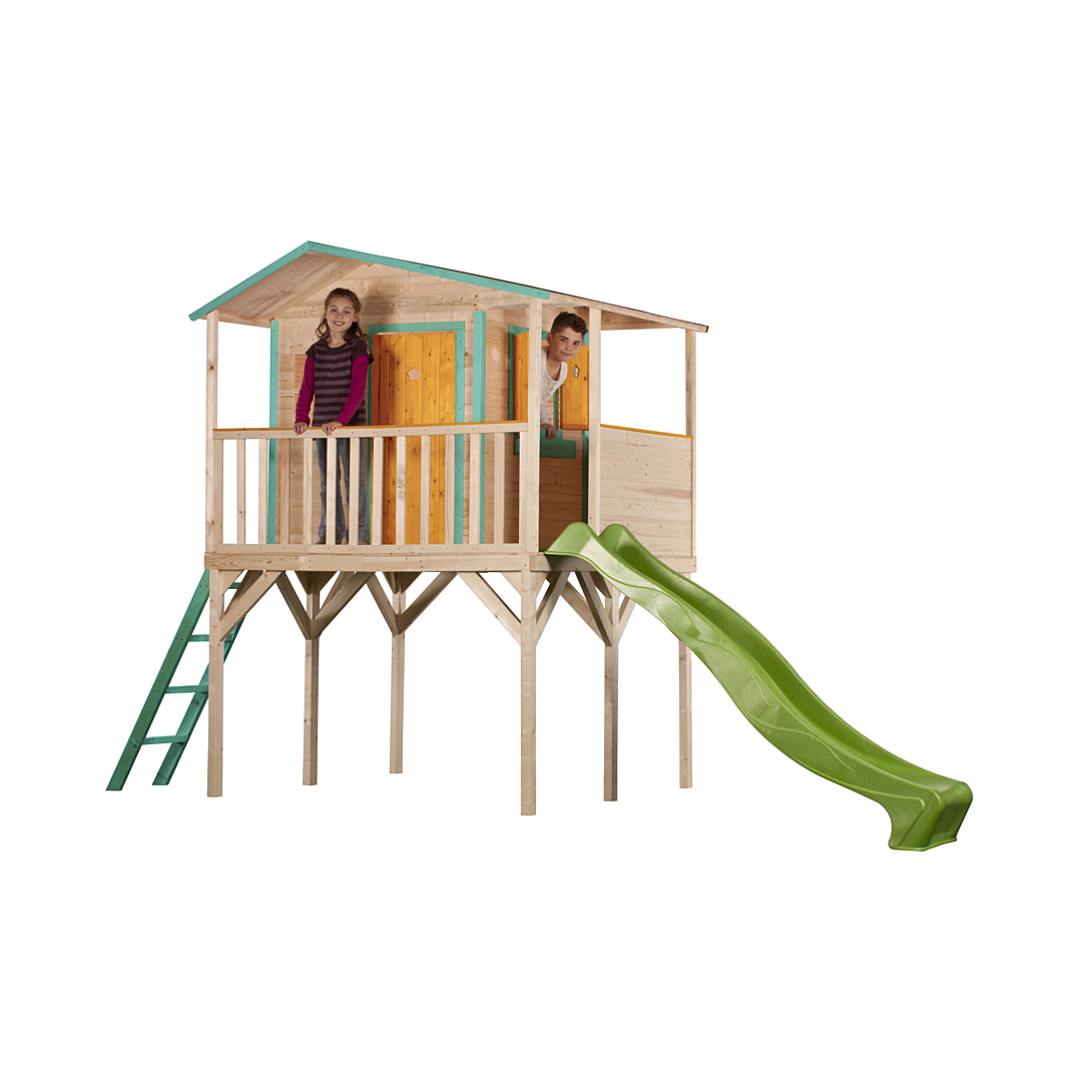 Grande maison sur pilotis 120 cm de hauteur avec patio et terrasse . Grand toboggan 250 cm