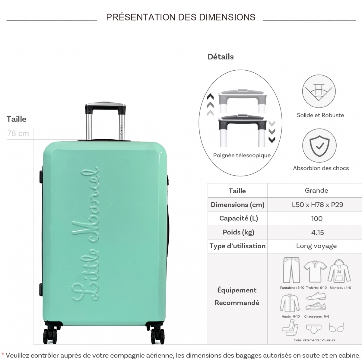 Les dimensions indiquées sont les dimensions extérieures des bagages, comprenant poignées, roulettes, pieds, poches latérales et autres éléments extérieurs.