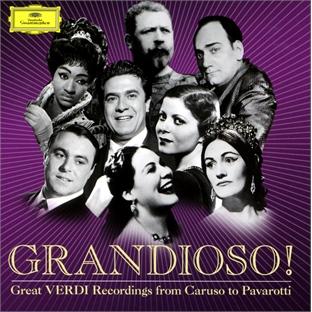 Deutsche Grammophon se devait de terminer en beauté cette année du bicentenaire Verdi. Grandioso propose donc en 7CD un incroyable kaléidoscope de plus de cent ans de grands enregistrements verdiens, du créateur d'Othello, Francesco Tamagno, capté en 1903, au premier 45 tours de Pavarotti pour Decca en 1964, sans oublier le grand Caruso. Si les chanteurs italiens se taillent ici la part du lion, ce somptueux coffret honore aussi les stars étrangères qui ont marqué de leur griffe l'art verdien, telles Grace Bumbry ou Fischer-Dieskau. Les meilleurs chefs dans ce répertoire ne sont pas non plus oubliés, particulièrement Ferenc Fricsay dont le légendaire enregistrement public du Requiem, réalisé en 1960, est ici reproduit en intégralité. Une analyse compète du grand spécialiste qu'est Richard Osborne ajoute un plus à cette anthologie de référence que tout amoureux de Verdi se doit de posséder.