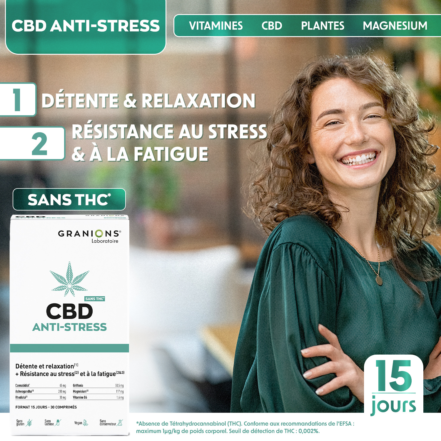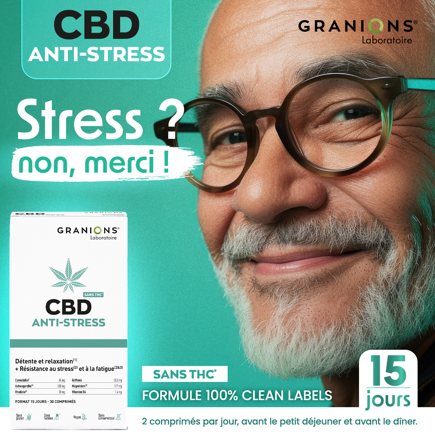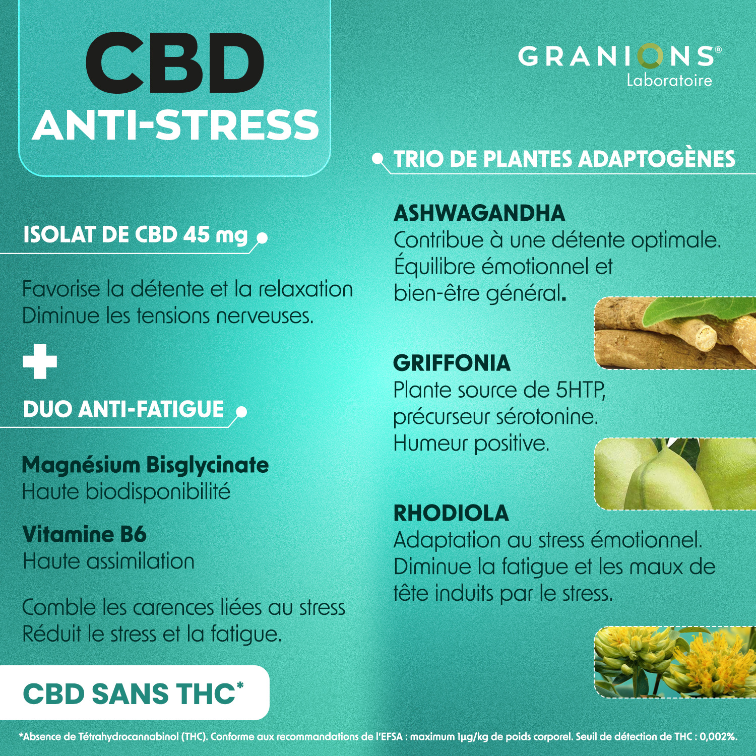 Granions® CBD Anti-Stress est un complément alimentaire élaboré pour combattre le stress et la fatigue tout en promouvant la relaxation, la sérénité et l'équilibre émotionnel. C'est une solution naturelle pour ceux qui cherchent à retrouver un état zen dans leur quotidien. La formulation soigneusement dosée de Granions® CBD Anti-Stress contient 45 mg d'isolat de CBD, qui respecte le dosage maximal autorisé de 50 mg. Le CBD, reconnu pour ses propriétés relaxantes et antioxydantes, est associé à une sélection de plantes, de vitamines et de magnésium, conçue pour renforcer la résistance au stress émotionnel et physique. Ce complément inclut un trio de plantes adaptogènes pour une synergie efficace : l'Ashwagandha pour une détente optimale, la Rhodiola pour réduire la fatigue liée au stress et la Griffonia, une source de 5-HTP, précurseur de la sérotonine, connue comme l'hormone du bonheur. La formule est enrichie d’un duo anti-fatigue, composé de Magnésium Bisglycinate et de vitamine B6, pour leur capacité à être bien absorbés par l'organisme, combler les carences induites par le stress, et réduire la sensation de fatigue.