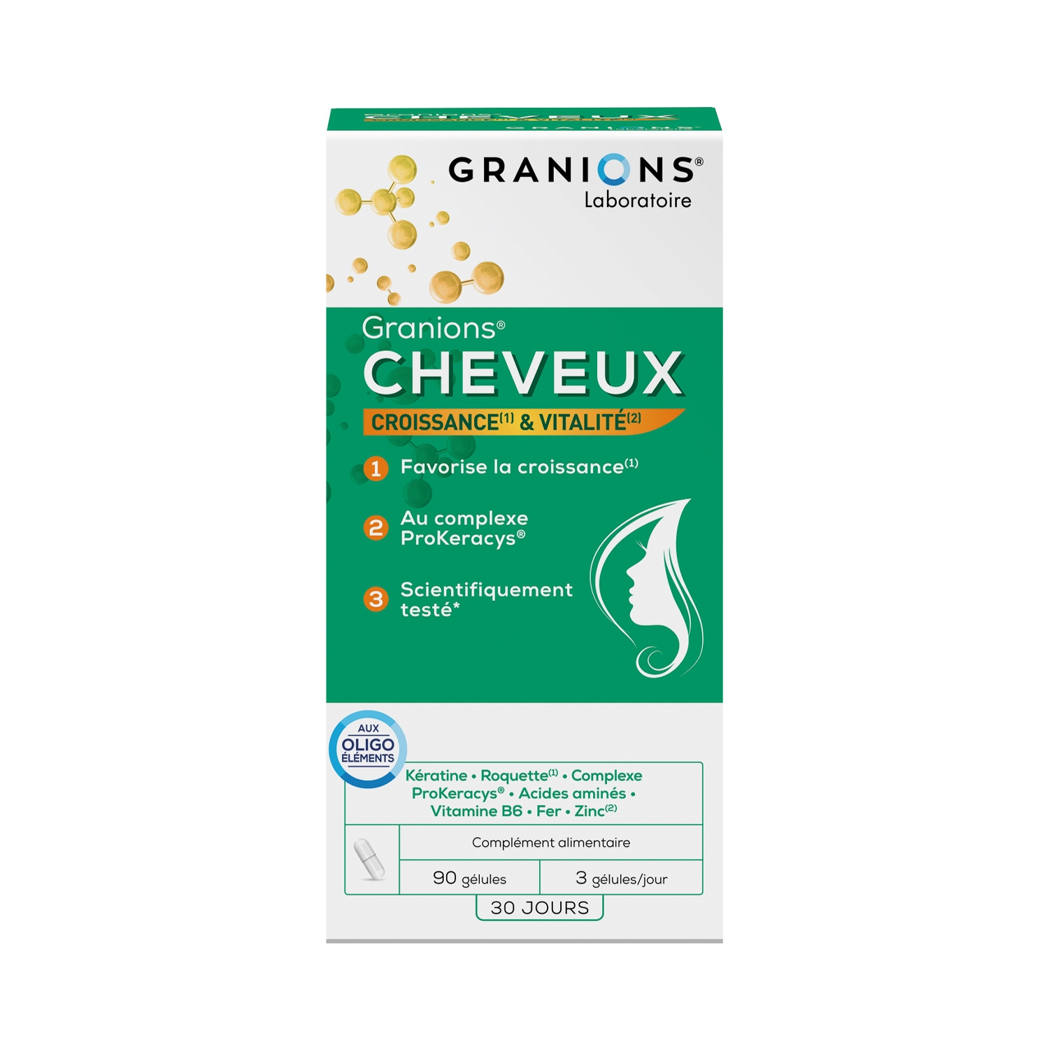 Fatigue, stress, changement de saison ou encore colorations à répétition sont toutes les raisons qui peuvent rendre vos cheveux plus fins, plus fragiles, plus vulnérables et ainsi ralentir leur croissance. Le Laboratoire des GRANIONS® a mis tout son savoir-faire au service de vos cheveux GRANIONS® CHEVEUX, une formule complète qui associe un complexe ProKeracys® (combinaison unique de L-Cystine et de Zinc(2) associés à la vitamine B6) à de la Kératine, L-Méthionine et L-Arginine, du Fer et des Vitamines du groupe B. La Roquette(1), quant à elle, stimule le bulbe des cheveux favorisant ainsi leur croissance.