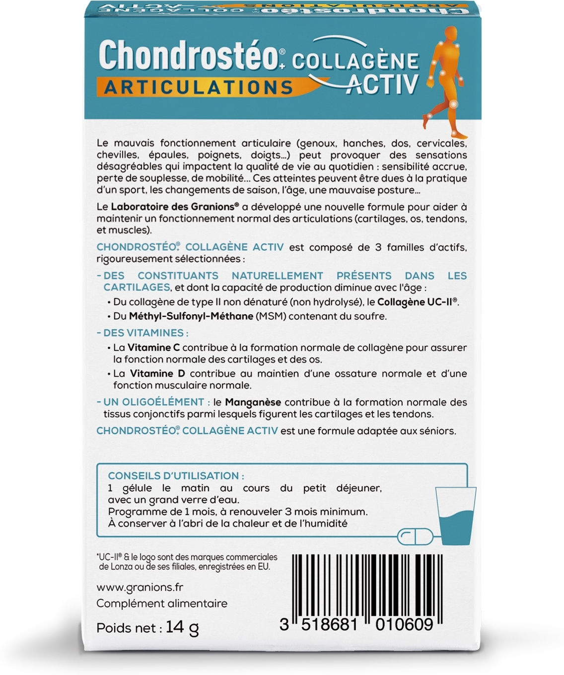 Les laboratoires Granions proposent Chondrostéo+ Collagène Activ Articulations, sous forme de gélules, qui aide à maintenir un fonctionnement normal des articulations.
