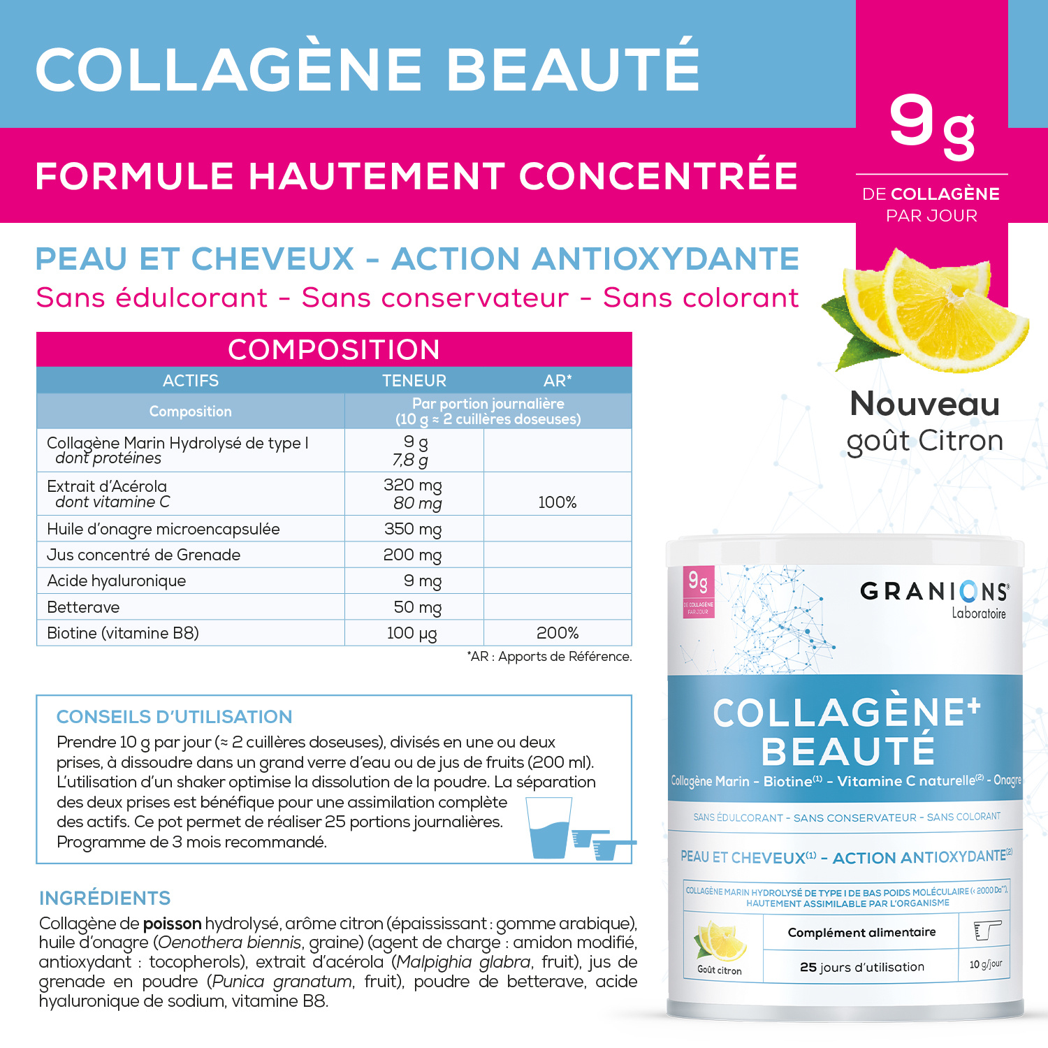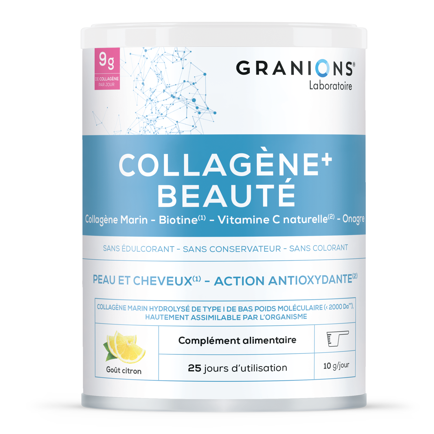 Le Laboratoire des GRANIONS a développé un complexe à base de Collagène en poudre hautement concentré et d’acide hyaluronique. L’association de la Vitamine C, puissant antioxydant et de la Biotine, qui contribue à la beauté de la peau et des cheveux, complètent la formule pour une action optimale. FORMULE Du Collagène marin de type I de bas poids moléculaire hautement dosé, très assimilable par l’organisme. De la Biotine, qui contribue au maintien d’une peau normale et de cheveux normaux. De l’huile d’Onagre et de Bourrache microencapsulées complètent la fomule. De la Vitamine C naturelle, issue de l’Acérola qui contribue à protéger les cellules contre le stress oxydatif et qui contribue à la formation normale de collagène pour assurer une fonction normale de la peau. Du jus concentré de Grenade et de la Betterave complètent la formule. De l’Acide Hyaluronique, molécule avec un fort pouvoir hydratant présente dans les tissus conjonctifs et reconnue pour améliorer la tonicité et la fermeté de la peau.