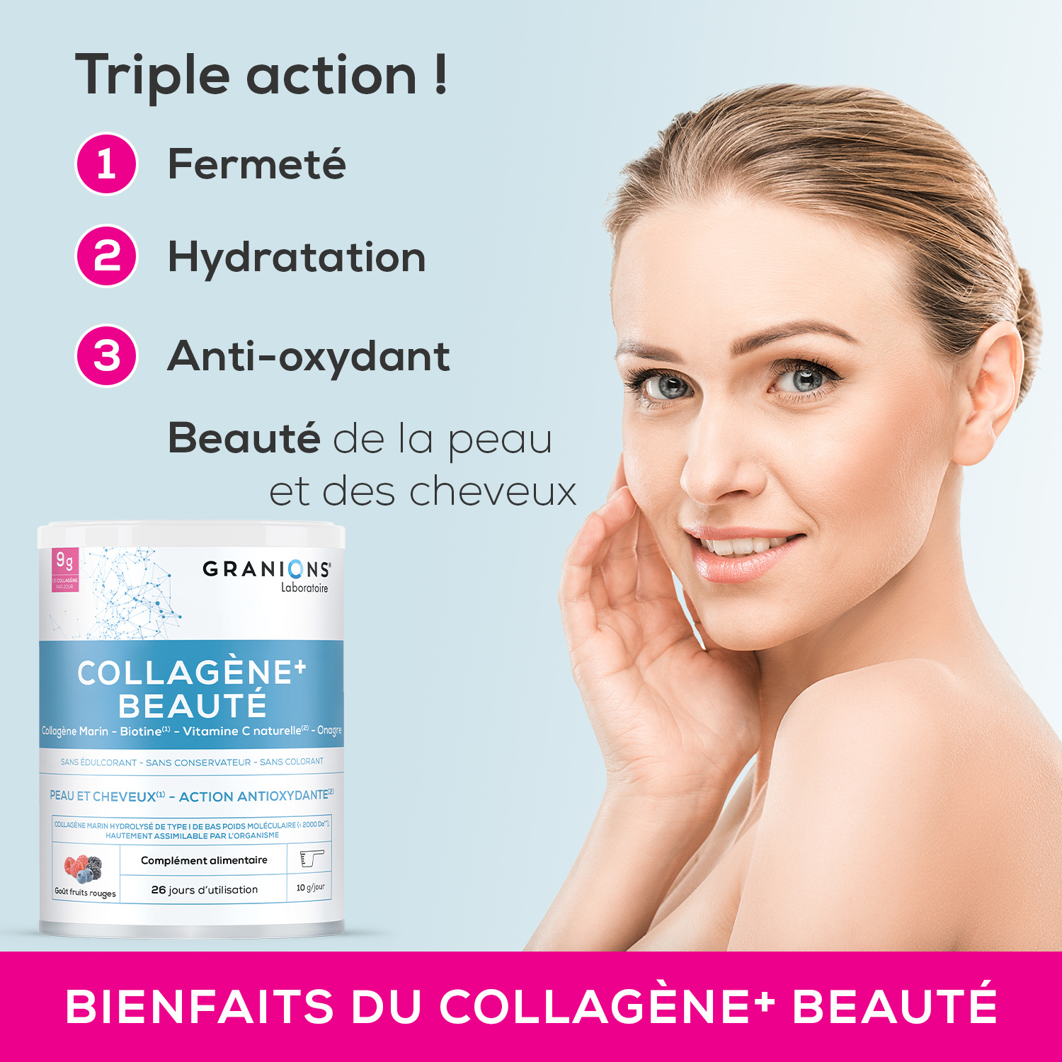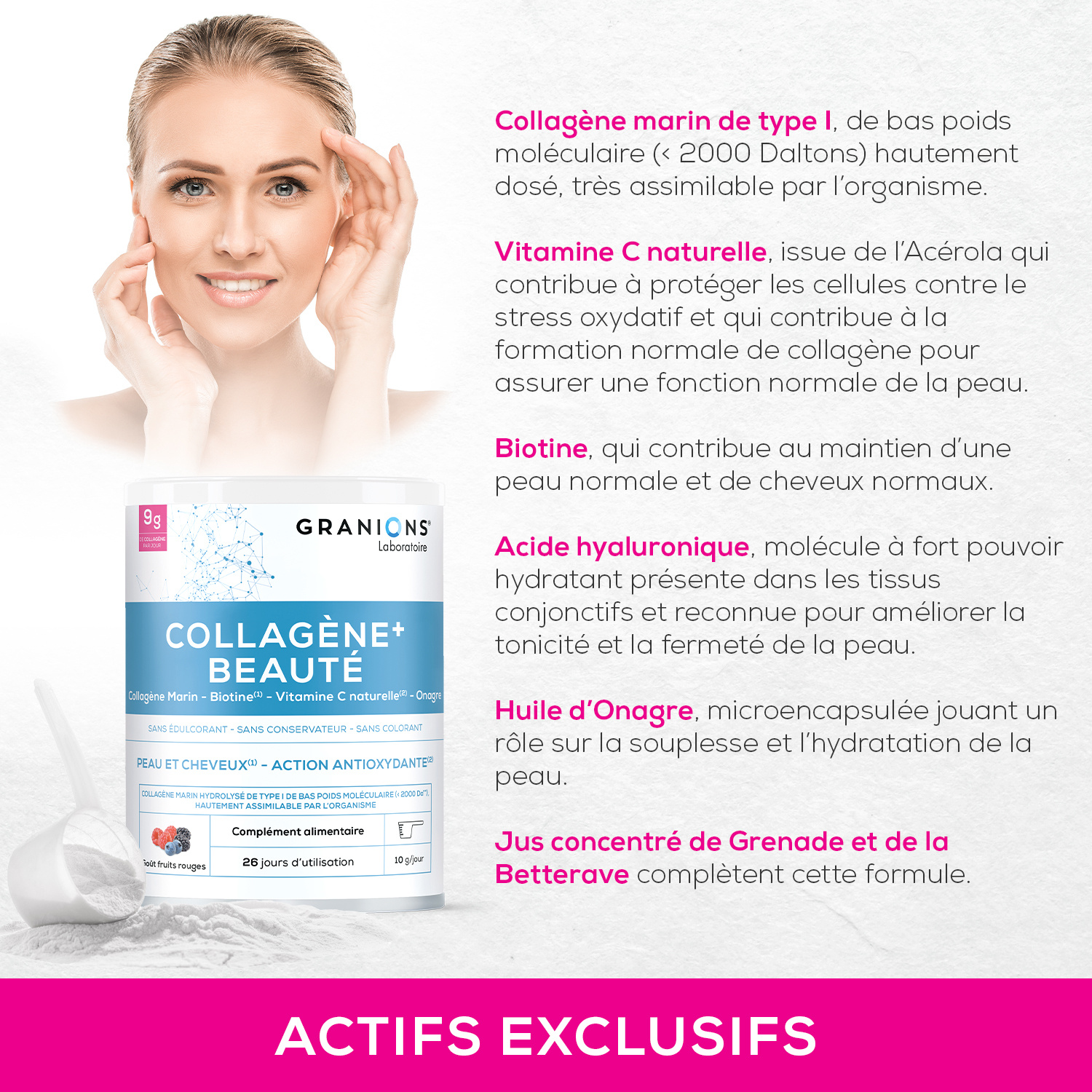 Le Laboratoire des GRANIONS a développé un complexe à base de Collagène en poudre hautement concentré et d’acide hyaluronique. L’association de la Vitamine C, puissant antioxydant et de la Biotine, qui contribue à la beauté de la peau et des cheveux, complètent la formule pour une action optimale. FORMULE Du Collagène marin de type I de bas poids moléculaire hautement dosé, très assimilable par l’organisme. De la Biotine, qui contribue au maintien d’une peau normale et de cheveux normaux. De l’huile d’Onagre et de Bourrache microencapsulées complètent la fomule. De la Vitamine C naturelle, issue de l’Acérola qui contribue à protéger les cellules contre le stress oxydatif et qui contribue à la formation normale de collagène pour assurer une fonction normale de la peau. Du jus concentré de Grenade et de la Betterave complètent la formule. De l’Acide Hyaluronique, molécule avec un fort pouvoir hydratant présente dans les tissus conjonctifs et reconnue pour améliorer la tonicité et la fermeté de la peau.